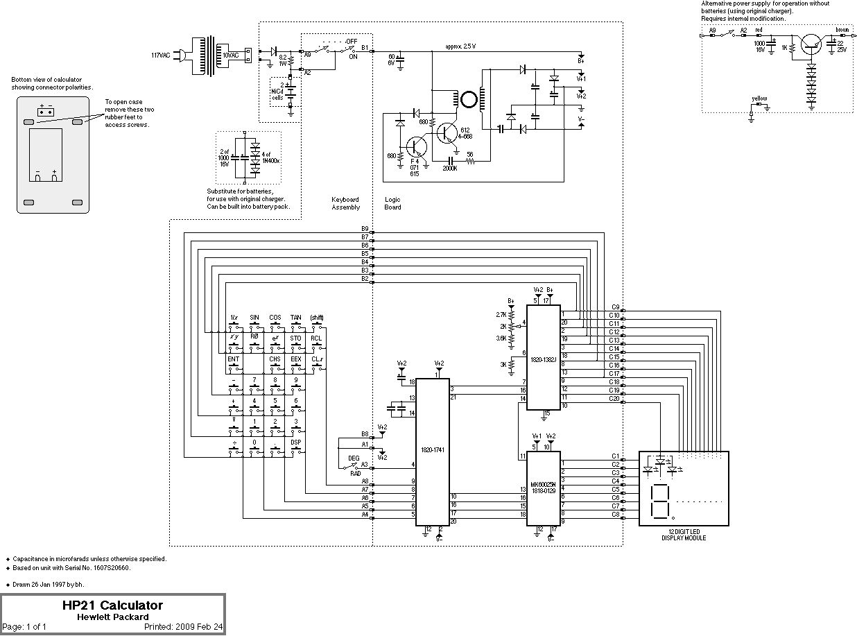 Hallo Thomas, ich würde langsam vom raten zum messen übergehen, daher möchte ich den Schaltplan für den HP21 in die Runde werfen. Viel vergnügen bei der Fehlersuche, gruß Garp. P.S. wenn in deinem Titel etwas von HP und Taschenrechner stünde, wäre es imho nicht verkehrt, dann hats die Forensuche später mal einfacher. P.p.s. Quelle http://www.cs.ubc.ca/~hilpert/eec/calctd/HP21.gif