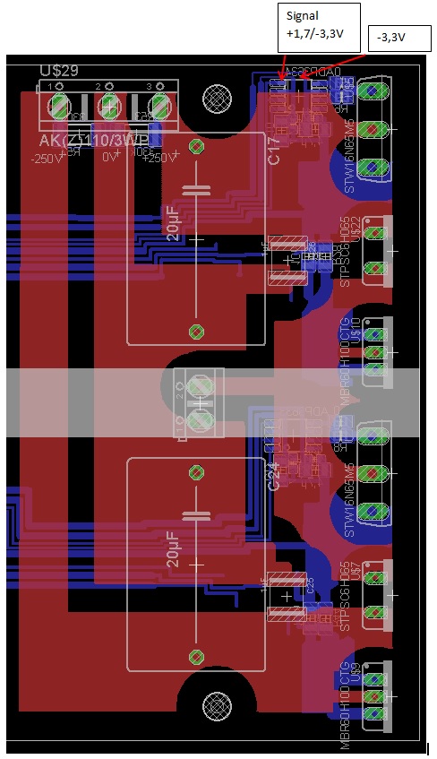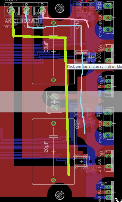 Hallo, man sieht das auf der Unterseite die Leiterbahnen zum Teil parallel zu den Top Leiterbahnen verlaufen. Gänzlich kann man dies auch nicht vermeiden. Wie wäre es für den Steuerteil eine extra Platine zu spendieren, die dann senkrecht vor den Leistungstransistoren sitzt? mfg. Klaus