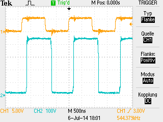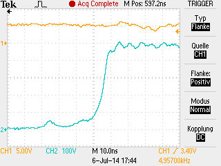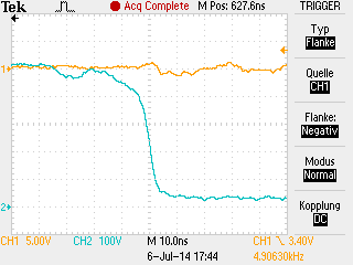 Weg mit dem Troll. schrieb: >>Angepeilte Leistungsdaten: >>Spannung: +/-250 V >>Strom: +/-10 A >>Frequenz: 500 kHz > > Dieses Projekt ist fuer das mangelhafte Wissen voellig ueberzogen. Lass > es sein, das wird nichts. @ "Weg mit dem Troll", ich finde es eine Frechheit, so etwas zu behaupten, wenn die Hintergründe vollkommen unklar sind. So etwas kommt in diesem Forum leider viel zu häufig vor. Ich denke bei den Anforderungen und "nur" einer 2-lagigen Platine ist es normal, dass im ersten Prototyp nicht alles perfekt ist. Eigentlich unnötig aber anbei ein paar Bilder der Schaltflanken um zu zeigen, dass ich nicht ganz auf dem Holzweg bin. Gemessen mit einem 200 MHz Scope. Würde mich weiterhin über konstruktive Beiträge freuen.