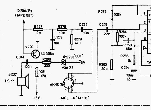 Ich habe mal das "Interface" einer Kassettenanbindung rausgesucht (LC-80). Links oben (Tape out) kommt das Rechtecksignal vom µC, dann geht es über R277 und das RC-Netzwerk bis zur Tape-Buchse (Pins 3 und 5). Das ist alles. Überhaupt nicht schwierig.