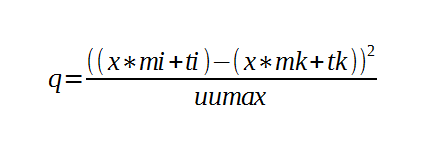 q*uumax = ((x*mi+ti)-(x*mk+tk))^2 (q*uumax)^(1/2) = (x*mi+ti)-(x*mk+tk) (q*uumax)^(1/2) = x*mi+ti-x*mk-tk (q*uumax)^(1/2)-ti+tk = x*mi-x*mk (q*uumax)^(1/2)-ti+tk = x*(mi-mk) ((q*uumax)^(1/2)-ti+tk)/(mi-mk) = x