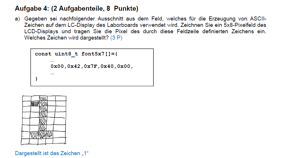>diesen habe ich als anhang zusammen mit der aufgabe hinzugefuegt, aber >ich verstehe nicht, wie man diese werte ablesen soll... Dein Array hat 5 Bytes. Jeder Wert stellt eine Spalte mit 7 Pixeln dar. Jedes 1 Bit im Byte ist ein gesetzter Pixel und jedes 0 Bit ein nicht gesetzter Pixel. Das musst du dann nur auf Karopapier mal einzeichnen und voila. Die niederwertigen Bits liegen dabei oben im Zeichen.