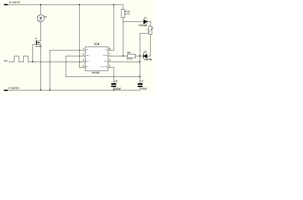 Der Motor ist ein 12 V Dc Motor, von Pollin. Er zieht im Leerlauf rund 2 Ampere. Die Bauteile sind richtig gewählt, wie gesagt Spannungen und Ströme zerstören die Schaltung nicht. Nachgebaut habe ich es nicht, ist selber zusammengestellt. Die Freilaufdiode habe ich eingefügt, seit dem hat der Motor fast gar keine Kraft mehr. Scheint so als würde ich mit der Diode den Motor kurzschließen. Wie gesagt, mein Problem ist ja das am IC ein pulsierendes Signal rauskommt. Aber an dem Stecker wo ich den Motor anschließe ein Dauersignal rauskommt. Ich versuche es morgen noch mit einem p-channel mosfet, evtl. hilft es ja. P.S. Den Kondensator zwischen GND und VCC is nun auch drin, hilft leider nicht.