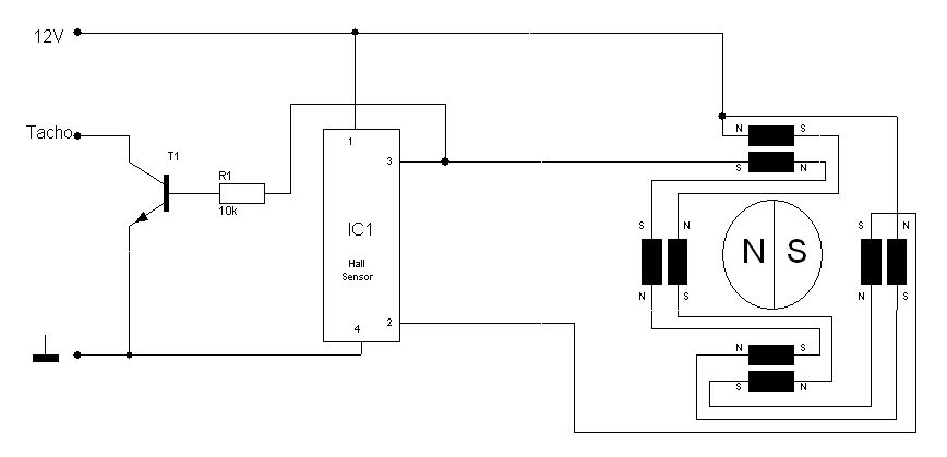 Just im Momment hab ich hier nen 40er Lüfter von Termaltake mit Lagerschaden. Also mal geöffnet. Auf der Platine is erwartungsgemäß nicht viel. Zwei Halbleiter,nen Widerstand und der 4-teilige Anker mit den Wicklungen. Ich hab die Schaltung mal gezeichnet. Der Chip ist Schaltstufe und Hallsensor in Einem. Eine Transe mit Vorwiderstand als Open Colector gibt den Tachoausgang. Soweit war ich in 5 Minuten. Die Wicklungen dauerten länger. Ich hab überlegt ob ich die Wicklungen Übersichtlich Zeichne oder so wie sie Mechanisch angeordnet sind. Hab mich für letzteres Entschieden auch wenn es chaotischer aussieht. Den Dauermagneten hab ich nur angedeutet. Wie man sehen kann sind es Von der Versorgung ausgehend zwei Stränge a 4 Wicklungen die gegen Masse geschaltet werden (IC Pin 2 u.3) Dh. beide Stränge gehen als Doppelwicklung über jede der 4 Kammern aber durch die Führung ergeben sich unterschiedliche Polungen. Ich hab se mal zur verdeutlichung als kleine Nord und Südpole eingezeichnet. Is zwar nicht korrekt aber es geht ja ums Prinzip. Ja und da sind wir schon beim Thema "Art des Antriebes". Offensichtlich haben wir hier also etwas wie einen Schrittmotor. Was die Eingangsfrage zur Drehrichtungsumkehr angeht so sollte,wie ich schon vermutete,eine Vertauschung der beiden IC-Anschlüsse 2 und 3 das gewünschte Ergebnis liefern.