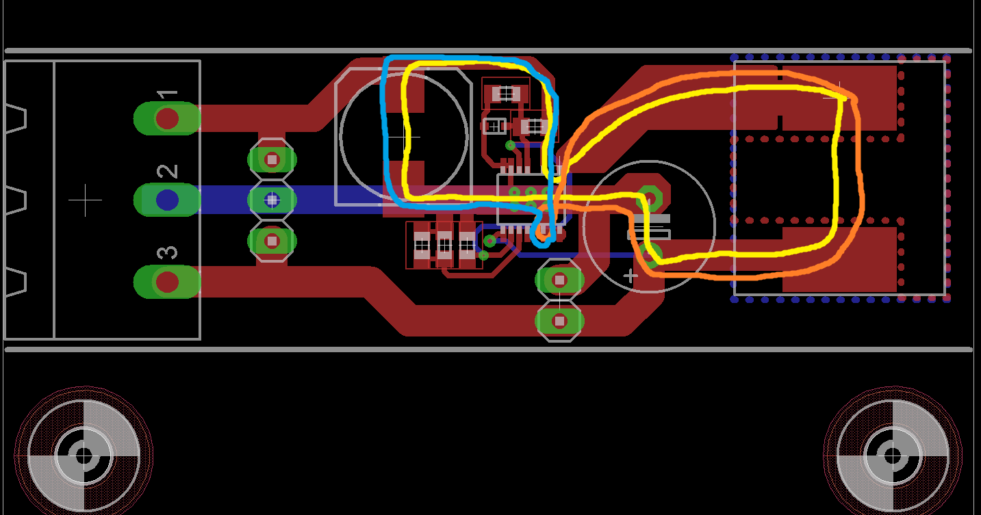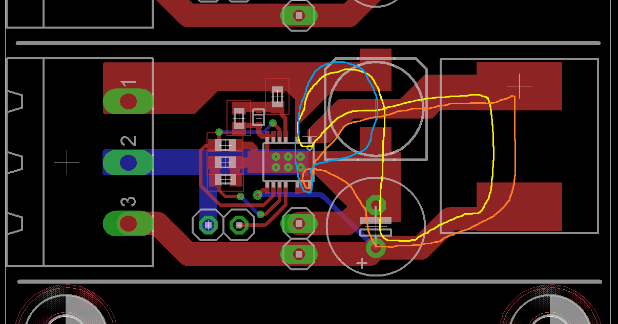 so, hab das Layout nochmal klein geändert,und direkt neben dem Ausgangskondensator einen pinheader hinzugefügt, um dort dann die Last anzuschließen. Hab mir auch mal die Stromlauflinien nach http://www.lothar-miller.de/s9y/archives/46-EMV-Op... eingezeichnet ( Gelb: Laden, Orange: Leerlauf, Hellblau: Umschaltzeitpunkt). Sind vielleicht ein wenig zu lang aber ich bin eigentlich recht zufrieden damit. Was haltet Ihr davon ?