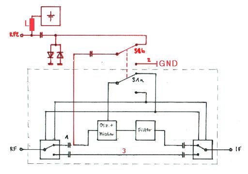 Hallo, ich möchte gern meinen Upconverter (https://code.google.com/p/opendous/wiki/Upconverter) mit einem zweiten HF-Eingang (30KHz ... 50 MHz) nachrüsten an dem eine phantomgespeisste Antenne angeschlossen werden soll. Die Modifikation soll, wie im Anhang dargestellt, erfolgen: Die Upconverter-LP ist gestrichelt dargestellt, alles innerhalb dessen ist also original. Ich möchte jetzt 1. den Kippschalter zur Wahl 'Upconverter/Passthrough' gegen einen mit zweiter Schaltebene ersetzen, 2. den Koppelkondensator (C37 im Originalschaltbild; s. Link oben) entfernen und 3. an das 'mischerseitige' Pad den zusätzlichen externen HF-Eingang wie im Anhang dargestellt anschließen Nun ergeben sich folgende Fragen: [1] Ist der Eingriffspunkt (Entfernung von C37) in den Upconverter der richtige? [2] Stellt die um ca. 3cm verlängerte Signalzuführung (geschirmt?) des zusätzlichen HF-Einganges (RF2) bzw. der elektromechanische Schalter ein Problem dar? [3] Gibt es Empfehlungen für den Limiter und den Entkoppel-Kondensator? [4] Stellen die offenen Anschlüsse 1 und 2 (s. Anhang) ein Problem dar? Da ich eher HF-Anwender als HF-Schaltungstechniker bin bitte ich meine vielleicht trivialen Fragen zu entschuldigen, gleiches gilt für evtl. fehlende Angaben zur Beantwortung der Fragen. Ich würde mich über Hilfe freuen! Grüße Dirk