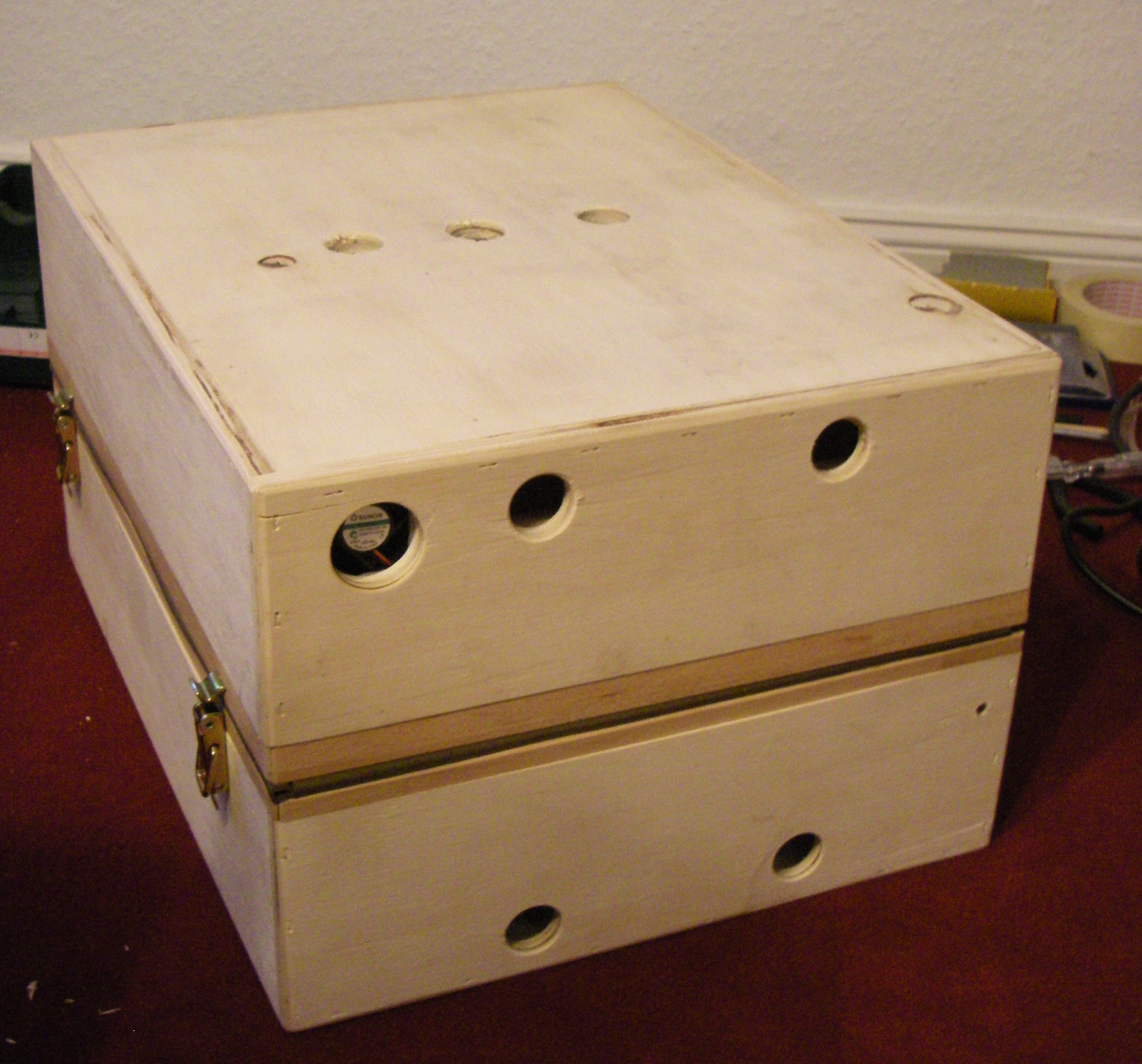 Harald Wilhelms schrieb: > Rudi P. schrieb: > >> Kannst du mir einen Link geben? >> Habe irgendwie soweit nichts darüber gefunden. > > Was meinst Du damit? Mit google findest Du jede Menge Hits: > https://www.google.de/search?q=LED+als+Lichtsensor Hallo Harald, danke für deinen Hinweis.Keine Ahnung nach was ich gesucht habe. Nun ist schon zum Glück um einiges klarer. > Viele Kunststoffe > vertragen ja kein UV-Licht. Ich hoffe, Du hast das bei Deiner > Konstruktion des UV-Belichters berücksichtigt. > Gruss > Harald Ich hoffe, das ich alles richtig gemacht habe. Die Kabel sind unter den Röhrenhaltern angeschlossen.Also durch die Platte gebohrt.Die Drosseln sind unter den Röhren in einem extra "Raum lichtdicht" untergebracht.Ich hoffe, das die Plastikbeschichtung der Grundplatte das auf längere Zeit aushält.Werd ich ja dann sehen. Nach einem ersten Langzeitbelichtungstest habe ich festgestellt(etwa 40 Minuten), das alles recht heiß wird, und eine Belüftung nötig ist. Diese habe ich dann mit Rohren aus dem Aquariumbedarf gebaut + einem 40mm Lüfter.Die Rohre sind in 90 Grad Winkeln verlegt (schneckenförmig) so das kein Licht nach aussen durchkommt.Sie Entlüftungslöcher kann man auf den ersten Bildern im Threat sehen -die schwarzen Löcher in beiden Seiten und der Lüfter, der an der Seite vom Gehäuse in einem Loch zu sehen. Die Glasscheiben habe ich dann jeweils einmal an den Ecken abgeschnitten, so das die Luft einmal durch das ganze Gerät durchgesaugt werden kann. Gruß Rudi