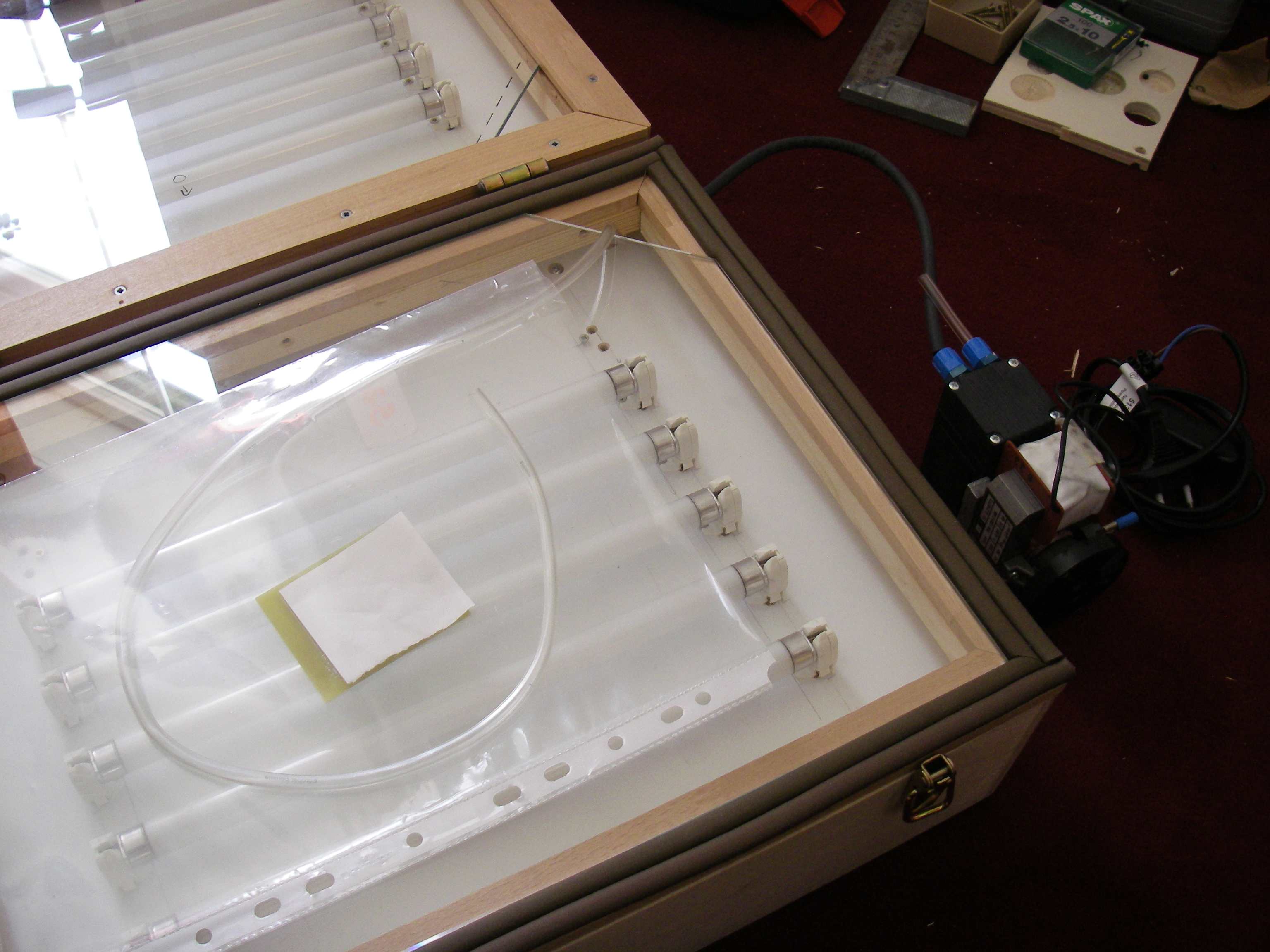 Dieter Frohnapfel schrieb: > Solarium-Brille oder UV-Schutzbrille ... billig in der Bucht, auf dem > Flohmarkt etc. Gute Idee.Bleibt nur noch der Hautschutz. > Wie presst Du denn die Folie an die Platine? Durch die Glasleisten und > das Dichtband hast Du ja ordentlich Abstand zwischen den beiden Kästen > ... Wie auf dem Bild zusehen ist werde ich wohl eine Klarsichfolie verwenden, die ich dann einfach an der offenen Seite mit breitem Klebeband zukleben werde. Erste Tests haben ergeben, dass das ganz gut funktioniert. Werde auch noch mal Zipperbeutel ausgibig testen. Für den Unterdruck verwende ich eine Pumpe die eigentlich zum Pumpen von Wein aus Weinfässern gedacht ist.Hab ich bei Ebäh gekauft. Der Schlauch ist durch das Gehäuse und die abgeschnittenen Glasscheiben geführt.Schlauchdicke beträgt 4mm. Der Abstand zwischen den Scheiben ist gar nicht so groß.Nur 5mm zwischen den Scheiben.Hab nochmal mit nem Stück Knetmasse nachgemessen.Also alles wie vorher berechnet. > Doppelseitige Belichtungen erfordern übrigens (zumindest bei mir) leicht > andere Belichtungszeiten, je nach Größe der Platine (Reflektionen) - > sofern die Ränder um die Platine herum nicht abgedeckt werden. Guter Tipp.Werde ich dann sehen wenn alles soweit ist. Kann dann ja nochmal Rückmeldung geben. Gruß Rudi