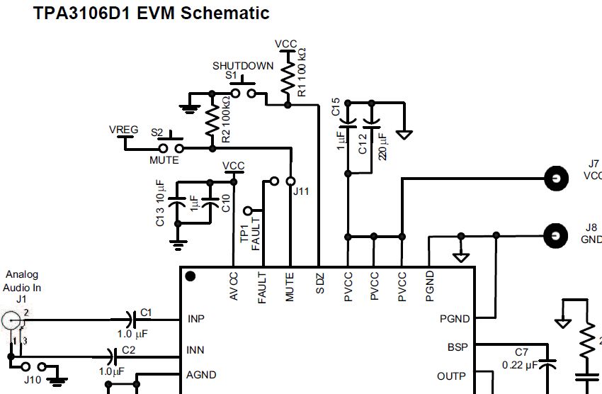 Hab jetzt was dazu in der Beschreibung zum EVM-Board gefunden (siehe Screenshot), demnach müssten Mute mit 100K Ohm auf Masse und Shutdown ebenfalls mit 100K gegen meine 12Volt. Aber was mit Fault ist, verstehe ich noch immer nicht so ganz. Denn könnte ich laut Datenblatt mittels OR-Gatter mit Mute verbinden und auch gegen Masse legen. Muss ich das machen oder kann ich Fault einfach offen lassen?