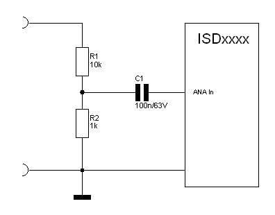 Ja mit "umbauen" hab ich mich etwas unglücklich ausgedrückt. Der Chip hat beides. Direkten Analog- und Microfoneingang. Das Micro kommt normalerweise an den Mic-Eingang und dessen ausgang wird dann einfache extern wieder an den Analogen Eingang durchgeschliffen. Das Spart man sich und geht direkt an den Analogeingang. aus dem Plan sieht man das nur 3 Bauteile nötig sind. R1/R2 als Eingangsteiler (Je nach Signal noch etwas anpassen) und der Kondensator zur Entkopplung. Im Anhang ein einfach hingekritzelter Plan.