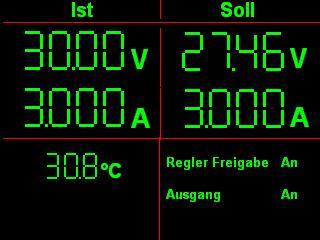 Komisch, Deine Ausgangsspannung ist über dem eingestellten Limit :-) Ich würde noch zwei große Indikatoren vorsehen, die Darstellen ob die Regelung gerade als Strom- oder Spannungs-Quelle arbeitet.