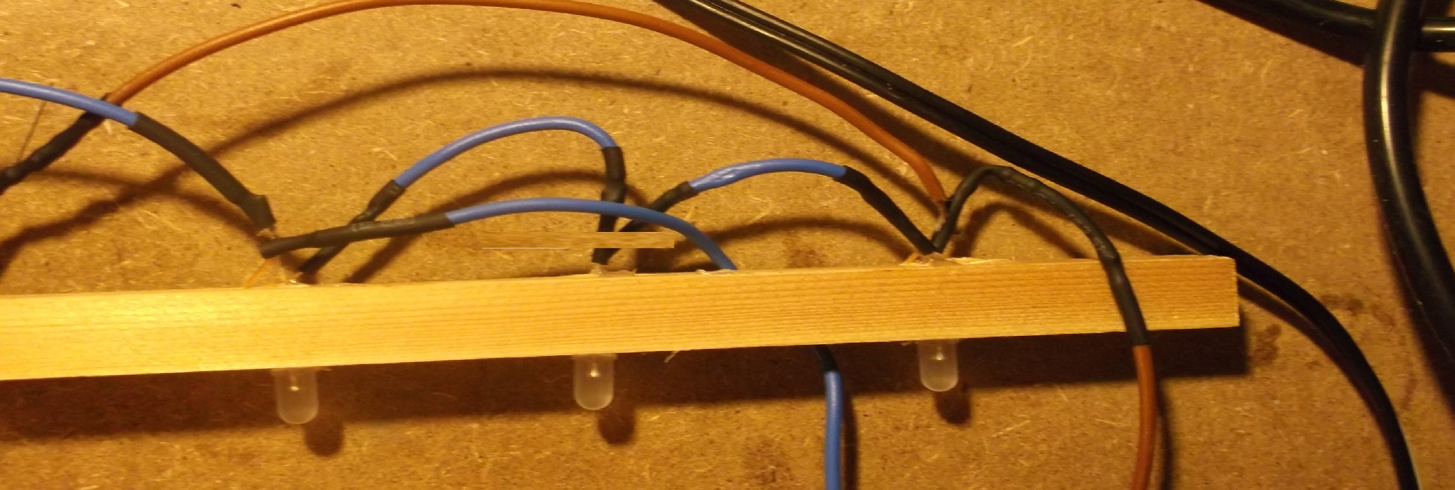 Sieht auf den Fotos nach ner fehlerhaften Verschaltung aus. Braun Plus, Blau Minus + Verbinder zwischen den LEDs richtig? Dann sieht das so bei dir als Schaltplan so aus: (+)-----R--------L---L---L----(-) | | -R-----L---L---L---| Würde bedeuten, daß die zweite Reihe nen höheren Widerstand hätte als die erste R1 + R2 also 300 Ohm, macht bei 2,7 V also nur noch 9mA. Kann leider nicht erkennen ob du noch mehr parallel geschaltet hast, das würde für die nächste Reihe dann echt kritisch weren. Wieviel LEDs haste denn dran?
