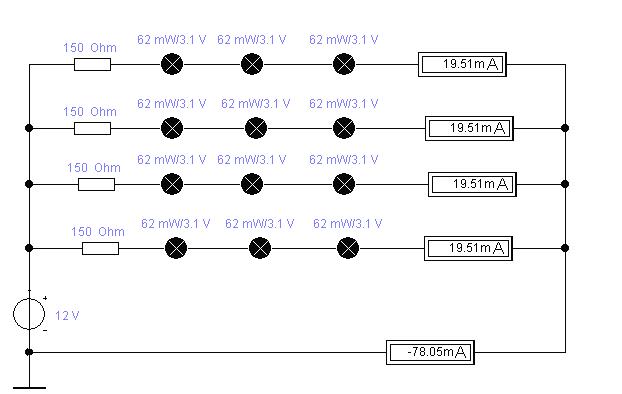 12V - 3(3.1V) = 2.7V I = U/R = 2.7/150 = 0.018A 18mA bei 3 leds in reihe mit 150r - wolltest du das so haben?