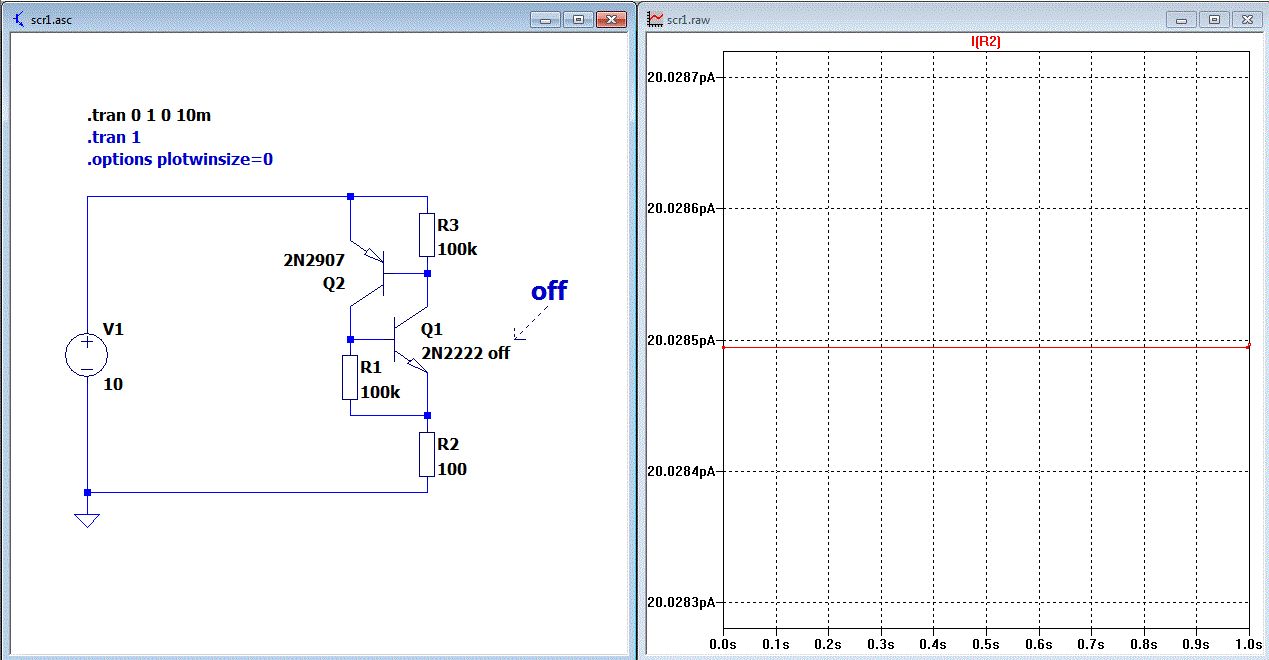 Beim Test einer Thyristor-Ersatzschaltung unter LTspice ergab sich die in den .tran-Bildern gezeigte Merkwürdigkeit. Bei .tran = 1s ist ein völlig anderes Verhalten, als bei der etwas "höher aufgelösten" .tran = 0.5s. Kann das jemand erklären? Dass sich die Verhältnisse mit allgemeinen pnp/npn-Transistoren von denen mit konkreten Transistortypen unterscheiden, ist mir noch einleuchtend... Sonntagsgrüsse aus Berlin PSblnkd