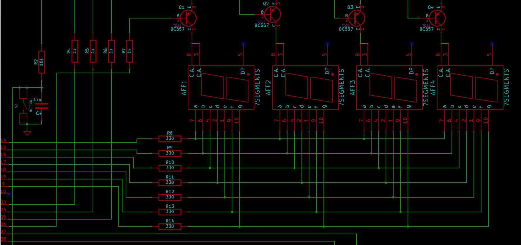 Hallo, ich habe vor eine einlagige Platine mit 4 7Segmentanzeigen zu entwickeln. Da ich dir vier 7Segmentanzeigen im Multiplexbeetrieb betreiben wollte, damit die Pinzahl nicht so groß wird, habe ich den Schaltplan aus dem Anhang benutzt, selber gemacht, aber abgeguckt ;-) Die vier 7Segment-Anzeigen sollen wie im zweiten Bild angeordnet sein, da diese ja zur Anzeige dienen. Ich würde diese auch gern so nah zusammen haben wollen. Nun habe ich das Problem, wie ich die routen soll? Kann mir da jemand einen Tipp geben, wie sowas sinnvol zu lösen ist. Bin noch Anfänger im PCB-Design und habe so ein Problem noch nicht gehabt. Hatte bis jetzt immer ausreichen Platzt auf den Platinen. Viele Grüße Juli