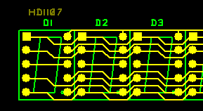 Hallo, die Anzeigen werden doch parallel verdrahtet bis auf die gemeinsamen Anoden (oder Kathoden). Da bietet sich an, die im "Memory"-Stil durchzuverdrahten wie im beigefügten Bild, notfalls braucht man dazu kleinere Pads, aber das ist bei DIP kein Problem. Dann bleiben nur noch die Anoden, da kannst du notfalls einen Draht nehmen. Georg