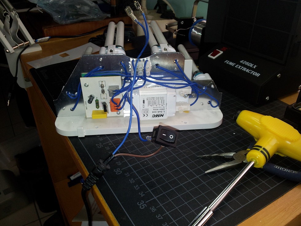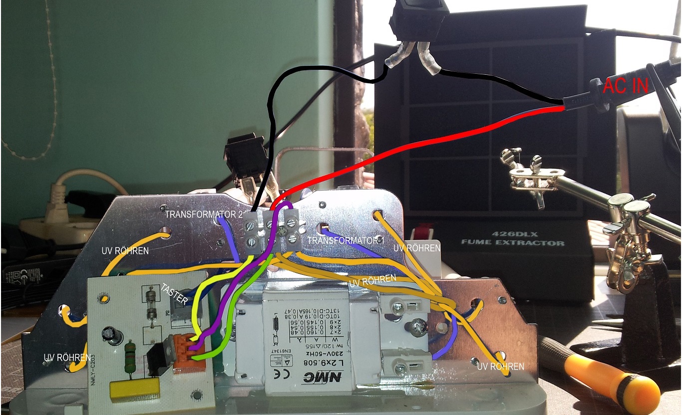 Du musst gelb und lila am oangen Klemme überbrücken, damit die Lampe dauernd leuchtet. Übrigens ist die Timer-Scahltung durchaus interessant, es werden einige Bauteile auf der Rückseite sein, darunter wohl ein CD4541. Interessant ist, d´ß die Schaltung it denTRAIC an den Leuchtstoffröhren mit konventioneller Drossel und Starter funktionieren und nicht kaputt gehen oder zumindest gestört werden. Es sind keine Trafos, sondern Drosseln, also grosse Spulen die vor die Röhren und deren Starter geschaltet werden, damit der Strom aus den 230V~ 50Hz ohne zu grosse Verluste auf den nötigen Wert begrenzt wird.