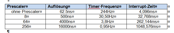 Hallo habe mir folgendes Beispiel gerade angeschaut: http://www.mikrocontroller.net/articles/High-Speed_capture_mit_ATmega_Timer Habe mir dann mal verschiedene Messzeiträume errechnet, siehe Anhang. Das heißt ich setze verschiedene Prescaler ein. kann mir einer sagen wie man jetzt die Genauigkeit des Messsystems berechnen kann für verschiedene Prescaler und ohne??