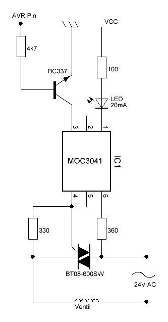 Alternative: Die Schaltung aus dem Datenblatt des MOC3041. Hier zusätzlich mit einem Transistor und einer LED zur Anzeige. Der Transistor weil ich 15 dieser Schaltungen an einem Atmega8 hängen habe. Bei nur 3 Schaltungen sollte es auch ohne den BC337 gehen.