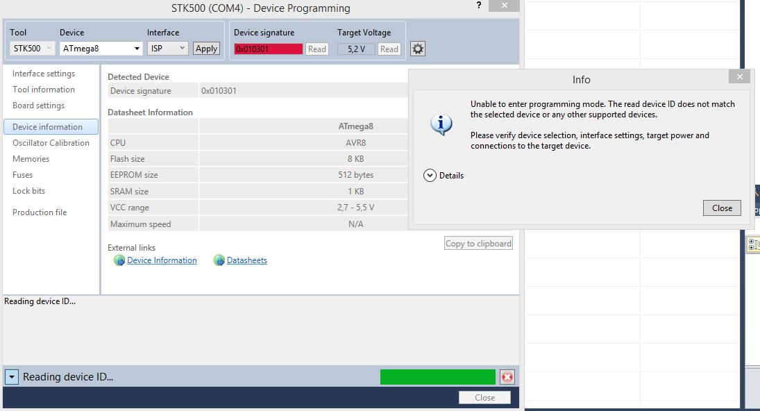 Hey, ich habe ein kleines Problem mit meinem neuen STK 500 Board: Wie auf den bild zu sehen ist, bekomme ich mit meinem ATmeg8 MC immer wieder einen Fehler, wenn ich die ChipID auslesen will oder wenn ich ein Programm aufspielen will. Wennn ich jedoch den mit gelieferten Chip 8515L einbau und auswähle, funktioniert alles ohne Probleme ... An der Verkabelung kann es ja nicht liegen, denn er bekommt ja eine ID nur kann er die nicht zuordnen. Jetzt bin ich mir nicht sicher ob der ATmega8 (neu gekauft) einfach kauput ist oder ob ich noch eine Einstellung vergessen habe. Danke für euer Hilfe obi_tobi
