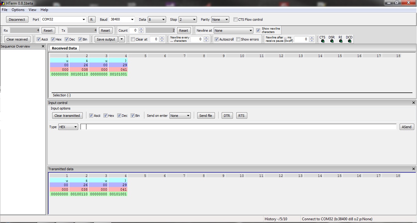Bei HTerm kann ich den Type einstellen. Ich stelle auf Hex und sende die 26. Würde ich auf Dec stellen, dann müsste ich die 38 senden.