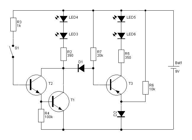 Lothar Miller schrieb im Beitrag #3752866: > Der T3 ist falsch rum drin. Nee, welchen Sinn hätte dann D2/R6? Außerdem würden dann beide LED-Reihen gleichzeitig schalten. T3 soll ein npn sein.