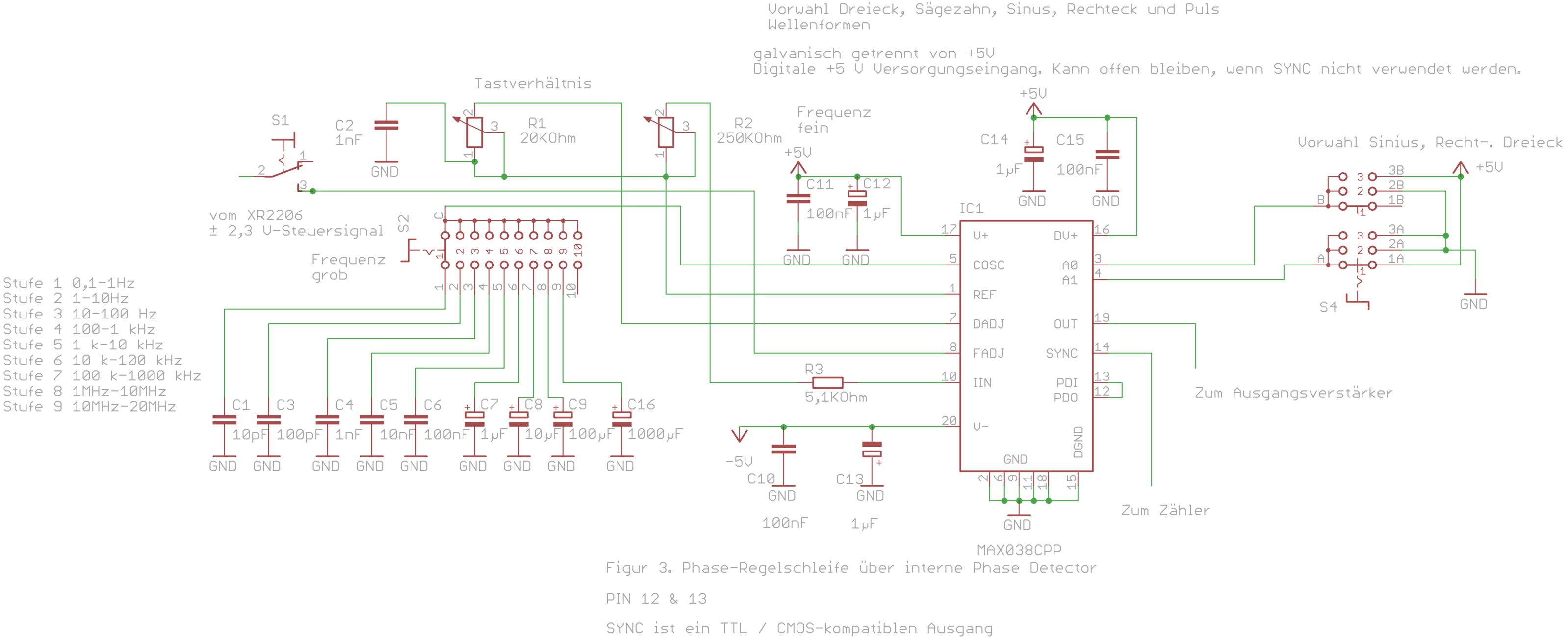 Wenn man den Phasendetektor nutzen will, dann ist das sinnvoll um ihn an eine stabile (digital einstellbare) Referenz anzubinden. Das ist heute ggf. schon ein DDS, oder halt auch nur ein µC der ein paar disktrete Frequenzen erzeugen kann. Dass man sich dabei für den DDS den Ausgangsfilter sparen kann stimmt leider nicht - auch für einen sauberen Rechteck brauch ein DDS ein Filter, der aber einfacher ausfallen kann. Es macht auch deshalb sich ein paar Gedanken über den DDS als konkurrierendes Konzept zu machen. Es lohnt halt nicht mit viel Aufwand die Schaltung mit dem MAX038 zu optimieren wenn ein DDS das viel besser kann. Das ist etwa bei der PLL Schaltung für Frequenzen im 1 kHz Raster der Fall. Wenn es um einen Generator ganz ohne µC geht, macht der Phasendetektor nicht so viel Sinn. Bestenfalls halt irgendwie als externen Eingang oder Option auf der Platine falls man später doch ein Erweiterung mit µC haben will. Die digitale Vorgabe der Frequenz geht nun mal vor allem mit einem µC - anders artet es eher in ein TTl Grab aus. Da ist vor allem die Frage was gewünscht ist. An sich reicht die Grundschaltung aus dem Datenblatt. Beim Ausgang könnte der ELV Plan eine relativ einfache Option sein (Schalter statt Relais). Der wesentliche Nachteil ist halt die etwas begrenze Amplitude. Bei den Funktionen ist halt immer die Frage was man haben will, und wie viel Aufwand. Die Möglichkeit zum Wobbeln lässt sich auch deutlich einfacher als beim ELV Plan analog mit einem einfachen Dreieckgenerator analog aufbauen. Das mindeste wäre eigentlich ein Eingang um die Frequenz durch ein externe Spannung festzulegen - das hilft dann auch gleich eine Lineare Einstellung zu bekommen, anders als im Plan ganz oben (da gibt es ein linear Periodendauer). Einen Frequenzzähler zur Anzeige der Frequenz würde ich wenigstens für später vorsehen (d.h. Abgriff für Rechtecksignal). Da gibt es Pläne hier im Forum die recht einfache sind (µc + 1-2 TTL ICs + LCD Anzeigemodul).