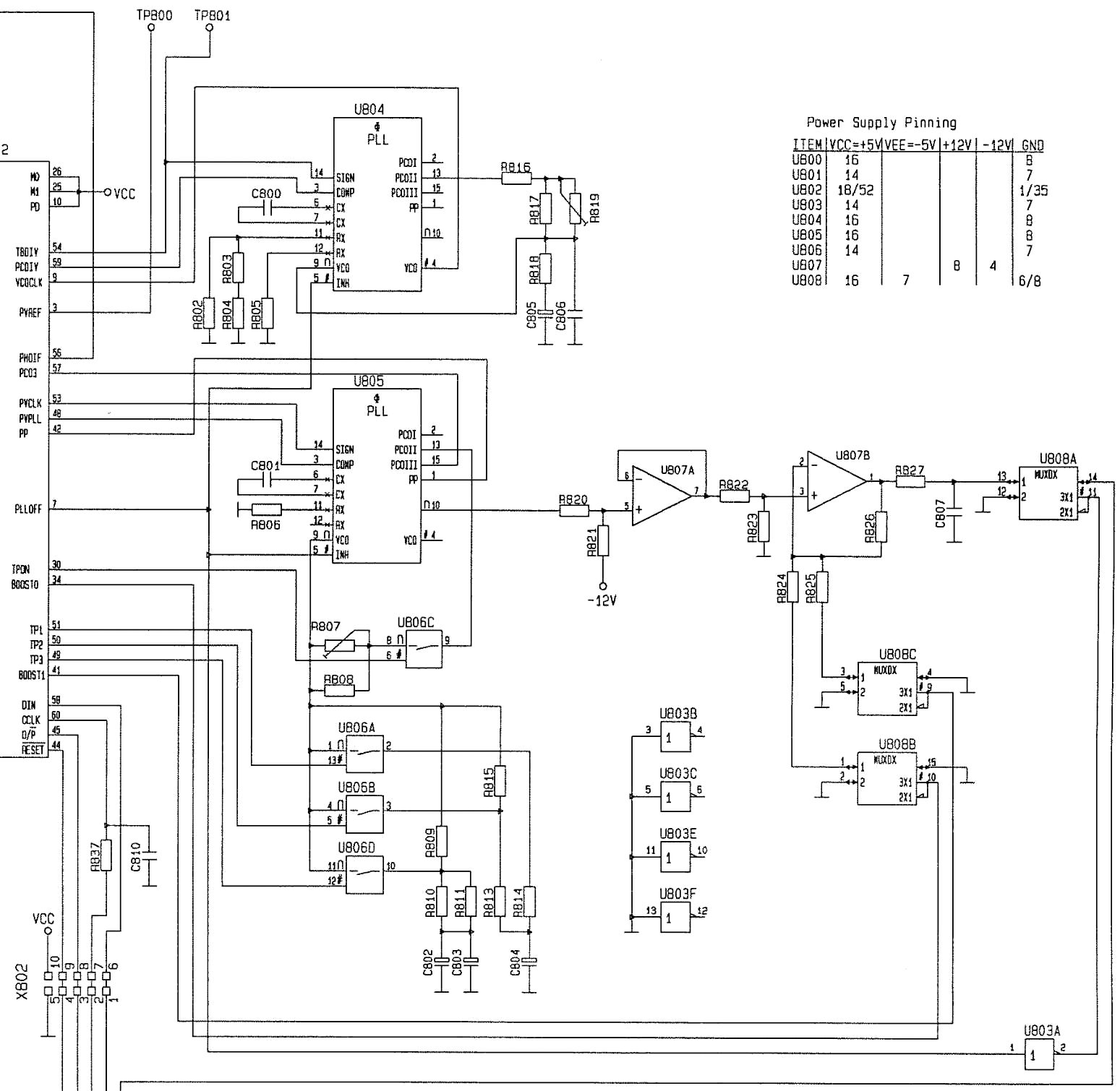 Wenn bei den CMOS Schalter zu viel Strom über die "Schutzdioden" fließt, kann es passieren das der Schalter durchschaltet, auch wenn der Eingang eigentlich auf aus ist. Der Zustand mit Spannung über der (5 V) Versorgung ist halt schon außerhalb des normalen Arbeitsbereichs. Ich fürchte da wird noch ein Defekt davor sein, der irgendwie dafür sorgt das die Spannung vom PLL zu hoch wird, selbst wenn der aus ist. Das könnten die anderen Teile des 4053 sein, oder der OP (U807) oder ggf. auch der 4046 sein. Der jetzt wohl fehlende 4053 ist kein Hindernis noch einmal nachzumessen. Die Inhibit Funktion des 4046 sollte noch gehen und am Ausgang des OPs beim ausgeschalteten PLL eigentlich 0 V bis etwa -0,6 V anliegen. Ohne den 4053 wirkt der 2. OP auch nur als Spannungsfolger.