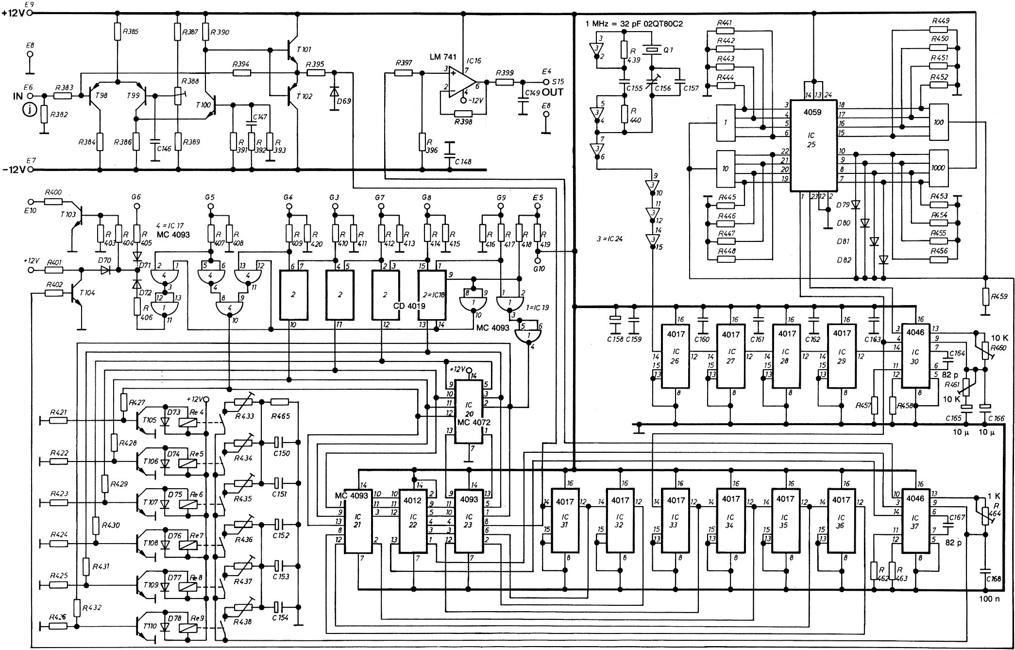 Die alten nicht low ESR Elkos sind nicht so kritisch, solange sie nicht viel Rippel abbekommen. Alle auf Verdacht austauschen lohnt da (noch) nicht. Bis jetzt ging es doch mit der Fehlersuche. So kritisch sollte der Kondensatorwert nicht sein, dass es da einen Unterschied macht ob 80 oder 100 µF. Die Werte für R820 und R821 klingen plausibel (wenn auch eher hochohmig) - andersherum macht kaum Sinn. Sinnvolle Testpunkte wäre jetzt etwa die -12 v Versorgung (die geht als Offset mit in die Steuerspannung mit ein) und vom unteren 4046 die Pins 3 und 14 (das sollte im einrasteten Zustand die gleiche Frequenz sein), sowie die Spannung an Pin 9. Pin 10 ist einfach nur die Spannung von Pin 9 gepuffert durch einen einfachen Impedanzwandler. Nicht eingerastet dürft das ein Extremwert sein. Die Spannung könnte man durch U807 verfolgen - wenn da kein Fehler ist hätte man den selben Extremwert, zumindest das gleich Vorzeichen. Bei den Pins 3 und 14 geht es nur darum das da ein sauberes Signal anliegt - nicht eingerastet wird das eine unterschiedliche Frequenz sein (Soll und Istwert der Frequenz im mittleren Bereich).