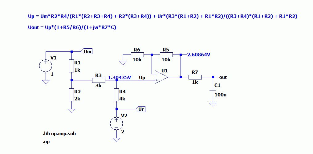 Up ist die Spannung am Pluseingnag des Opamps. Mit Überlagerungsmethode: Up = Um*(R2||(R3+R4))/(R1 + R2||(R3+R4)) * R4/(R3+R4) + Ur*(R3 + R1||R2)/(R4 + R3 + R1||R2) Up = Um*(R2*(R3+R4))/(R1*(R2+R3+R4) + R2*(R3+R4)) * R4/(R3+R4) + Ur*(R3 + R1||R2)/(R4 + R3 + R1||R2) Up = Um*R2*R4/(R1*(R2+R3+R4) + R2*(R3+R4)) + Ur*(R3*(R1+R2) + R1*R2)/((R3+R4)*(R1+R2) + R1*R2) Uout = Up*(1+R5/R6)/(1+jw*R7*C) (Ich habe die Formel für Up mit einem Beispiel mittels LTspice geprüft.)