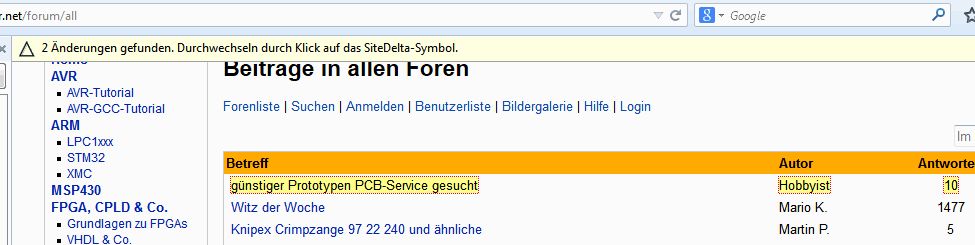Nutze nun diese Site-Delta-Programm. Es kommen auch Meldungen "7 Änderungen gefunden. Durchwechseln durch Klick auf das SiteDelta-Symbol" - doch weder das Delta vor dieser Meldung noch das Delta oben rechts neben der Suchleiste führt zu irgendeiner Reaktion. Wo steckt denn das SiteDelta-Symbol?