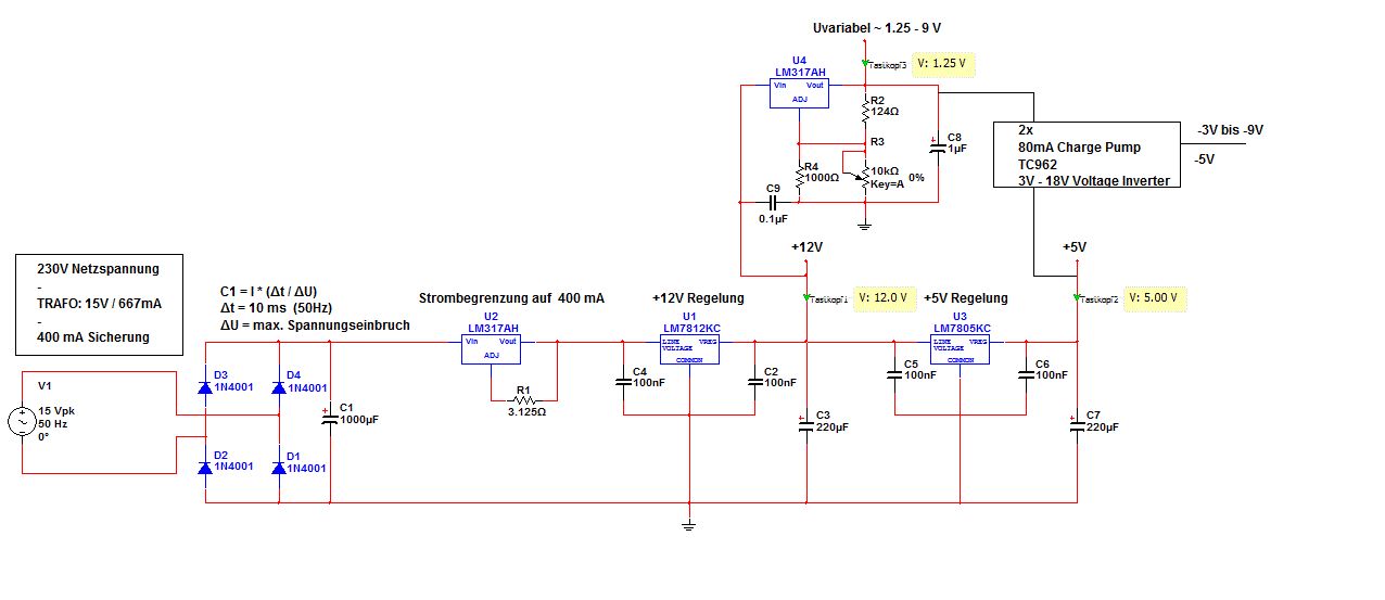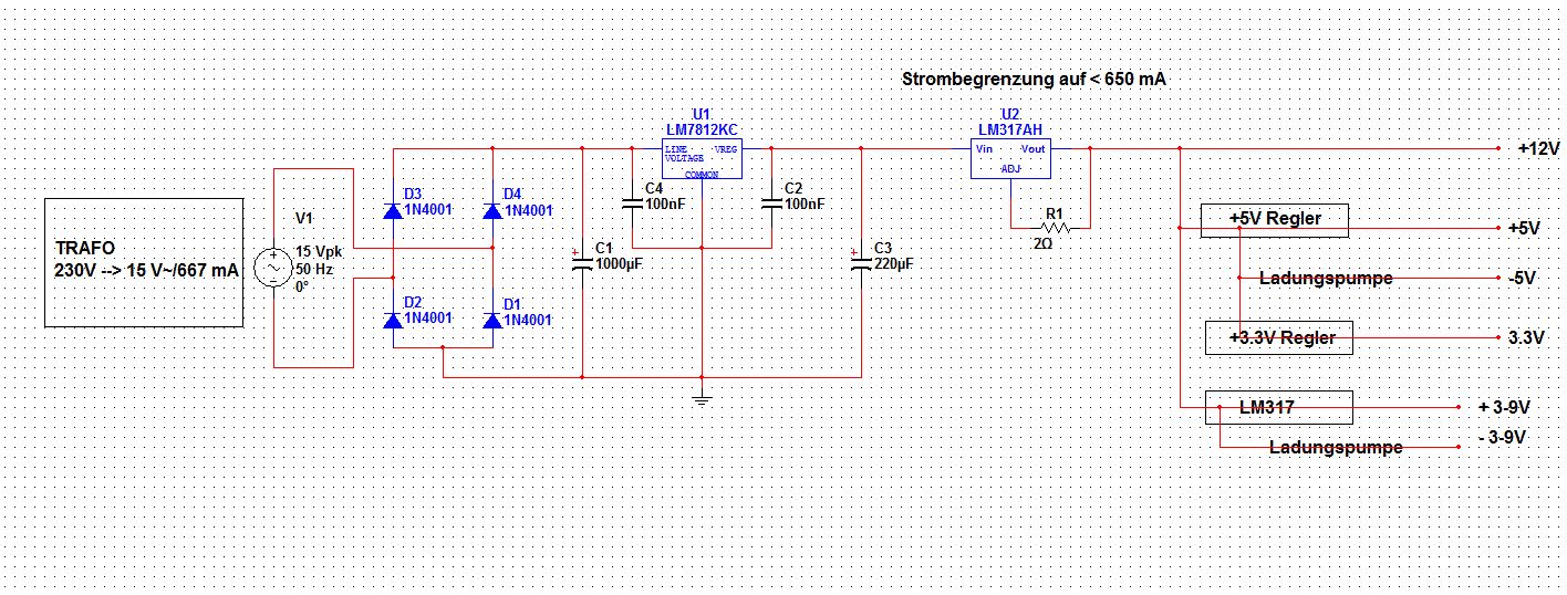 Danke für eure Hilfe!! Hab meine Schaltung etwas überarbeitet =) Strombegrenzung ist jetzt (hoffentlich richtig) auf 400mA ausgelegt. Zum erzeugen der negativen Spannung würde ich aber gerne die ICs benützen die im Schaltplan eingezeichnet sind da die bis zu 80mA belastbar sind und außerdem auf meinem Schreibtisch liegen ;) Hoffe die Schaltung ist schon mehr realistisch..