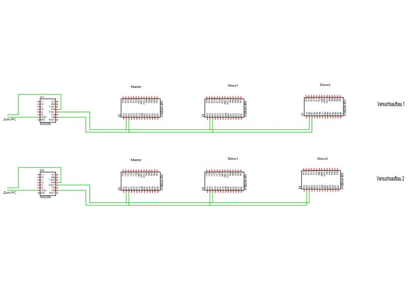 Hey also ich Teste es aktuell mit kurzen Leitungen. Es funktioniert die Kommunikation zwischen den Atmegas nicht. Wenn ich aber jeden Atmega einzeln Teste mit Terminal Programm dann funktioniert es genauso wie es soll. Also brauch ich vor jedem Controller nen MAX232 ? Ich habe nur einen vor dem ersten und dann bin Ich vom Master RxD an Slave TxD und umgekehrt. Leider haut des dann nicht mehr hin.