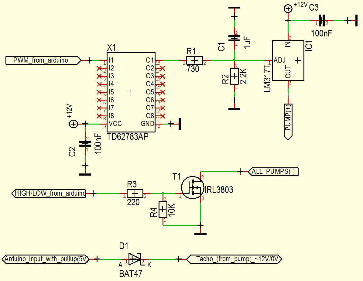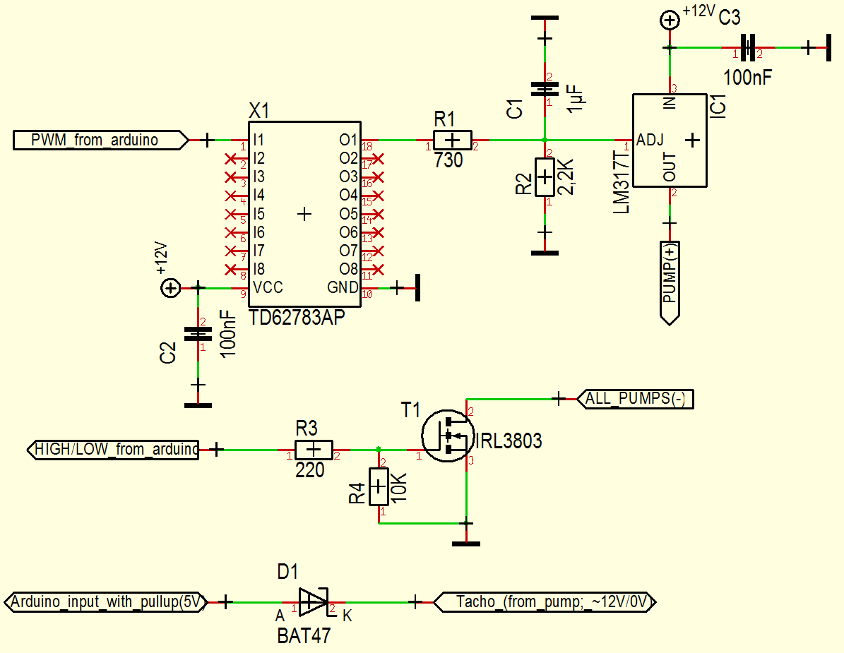 ...ich kann noch hinzufügen, dass ich das Darlington Array, die Spannungsregler und die Pumpen auf Funktion überprüft habe (nachdem der Arduino seinen Geist aufgegeben hat), indem ich alle Eingänge des TD62783AP mit 5V verbunden habe, worauf alle Pumpen anliefen! - In der übrigen Schaltung ist also nichts kaputt!
