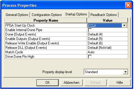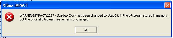 Das hat nix mit Jumpereinstellungen zutun. in deinem Project gehst du auf 'Generate Programming File' und über rechte Maus und Eigenschaften kommst du in den Dialog 'Process Properties'. Auf dem Tab 'Startup Options' kannst du die Startup Clk des Fpga einstellen und wenn du per FTAG einspielen willst dann ist das JTAG Clock und nicht CCLK. :) Nach den umstellen und neu builden sollte die Meldung weg sein.