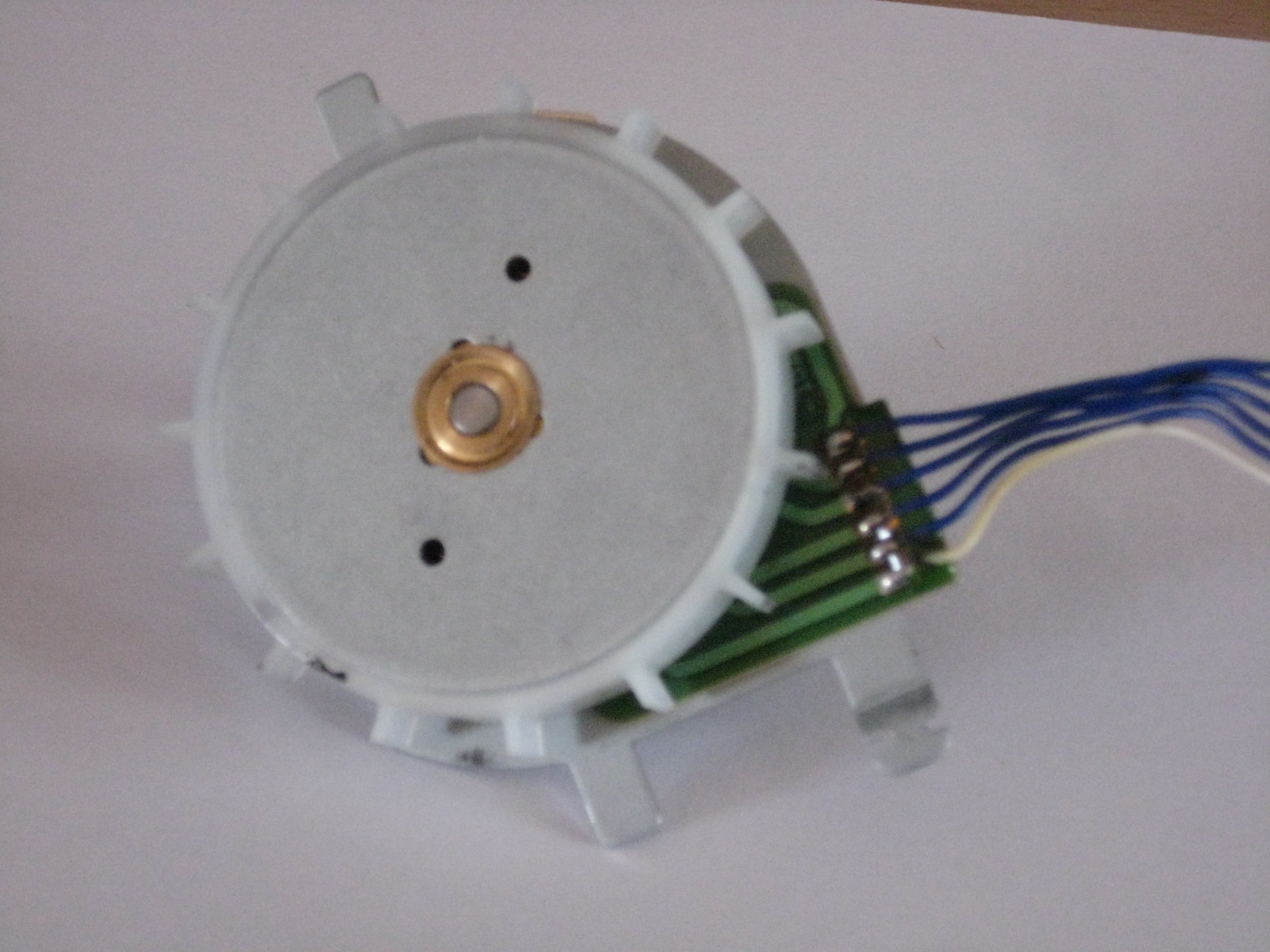 Hallo, Deine Messungen lassen eher auf eine 3-Phasigen Motor schließen, also kein Schrittmotor. Vielleicht ist das ja der Antriebsmotor eines Disketten- oder CD/DVD- Laufwerks, der die Scheibe dreht. Die 3 anderen Anschlüssen werden dann ein Hallsensor sein, der normalerweise einen Impuls pro Umdrehung liefert. Der hat dann als Anschlüsse Masse, VCC, ind das Ausgangssignal, Betriebsspannung ist da oft 5V. Wenn Du hast, könntest Du ja mal probieren, ob er an einem Regler/Steller für Modell-Brushlessmotoren läuft. Mit freundlichem Gruß - Martin