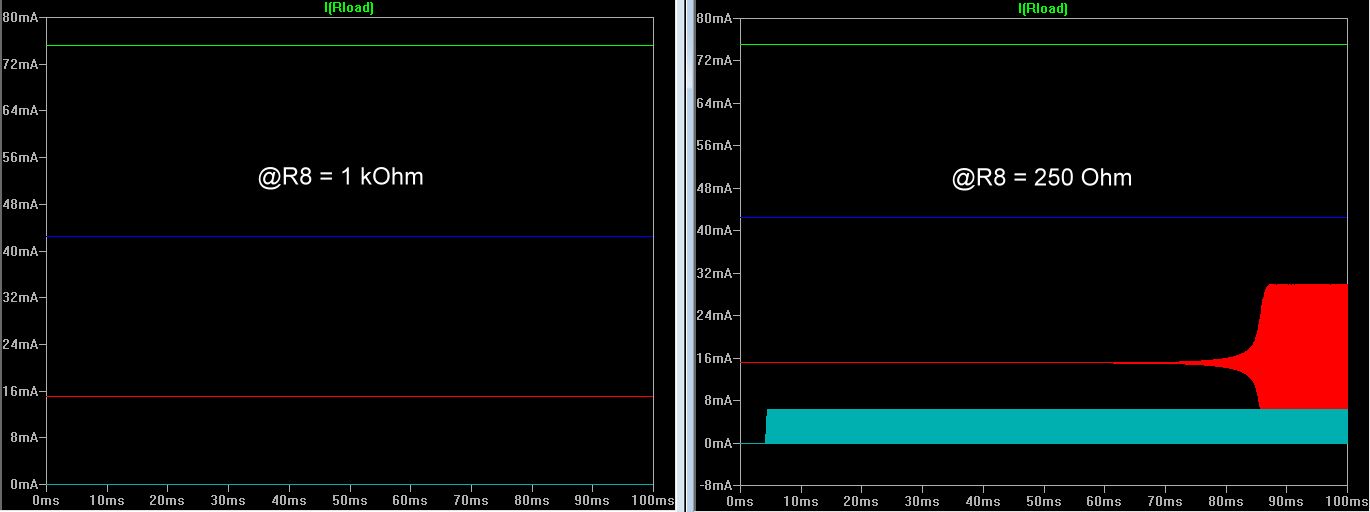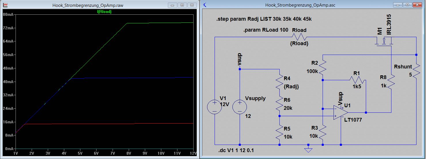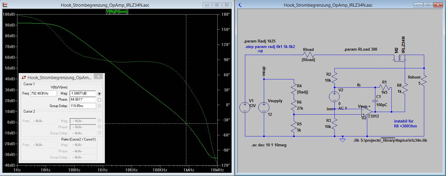 Hallo wieder mal, ich bin zurück, eine dumme Frage zu stellen. Im Grunde geht es mir darum, ob die Schaltung, die ich in LTSpice zusammengebastelt habe, den Test der Realität überstehen würde. Es geht um einen Aufbau, der mir im Kurzschlussfall den Strom begrenzt. Ja, ich weiß, davon gibt's schon Schaltungen wie Sand am Meer und auch viele erprobte... Bei den meisten Schaltungen mit Biplor-Transistor stört mich jedoch der 0.7V Spannungsabfall am Basis-Emitter-Widerstand. Also lieber eine OpAmp-Schaltung... Darüber hinaus hatte ich vor, die Strombegrenzung vom µC aus einstellbar zu gestalten, soll heißen, ich will einstellen können, wie viel Strom maximal durch den Lastwiderstand fließt... Ich habe mich also mal hingesetzt und eine Schaltung entworfen (mit ein wenig Hilfe und Inspiration unter anderem von hier: Beitrag "Strombegrenzung" ) Herausgekommen ist das Ungetüm im Anhang. Und jetzt die Preisfrage: Hält das Teil ind er Realität, was LTSpice verspricht? Ich habe leider keine Komponenten da, um es auszuprobieren, daher meine Frage an die Erfahrenen unter Euch. Wie weit ist Spice zu trauen? Wie ihr (hoffentlich) sehen könnt, variiere ich den Radj-Widerstand im Bereich 30k-45k und es stellt sich auch ein unterschiedlicher maximaler Strom ein, der über den Lastwiderstand fließt. Ich kann also theoretisch Radj durch ein 50k Digi-Poti ersetzen und damit den maximal fließenden Strom einstellen. Und da ist im Normalfall (bei normalem Rload) einen maximalen Strom von etwa 40mA haben will, fallen über dem Shunt-Widerstand im Normalfall maximal etwa 200mV ab, deutlich besser als die 0.7V BE-Spannung beim Biplor-Transistor. Von daher so weit so gut. Eine Transienten-Analyse zeigt mir, dass die Schaltung auch stabil arbeitet, ohne zu schwingen. ZUMINDEST solange, wie ich den Gatewiderstand R8 im Bereich von 1k dimensioniere. Gehe ich nennenswert drunter (z.B. 250 Ohm), beginnt die Schaltung im Bereich kleinerer Ströme zu schwingen. Und jetzt werde ich unruhig: Ist die Schaltung, die ich da zusammengenagelt habe, so instabil, dass ein falscher Wert reicht, sie zum Schwingen zu bringen? Reichen Bauteil-Wert-Unterschiede aus, die Schaltung instabil werden zu lassen? Kann mir jemand von Euch sagen, ob ich da einen kapitalen Bock geschossen habe oder ob die Schaltung auch in "Realität" auf der Platine das tut, was sie tun soll?