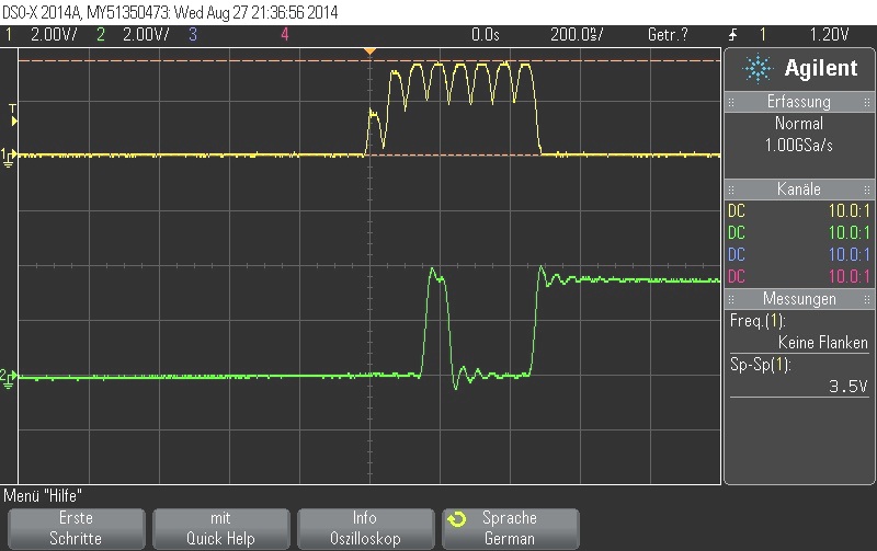 Möchte mit einem PIC18F26K22 über SPI einen Grafik Controller Chip FTDI FT800 ansteuern. Ich verwende MSSP2 und benutze den Internen 16MHz Oszillator zusammen mit der 4-fach PLL. Wähle ich als Clock Freuquenz für SPI 4MHz funktioniert alles perfekt. Wähle ich als Clock Frequenz 16MHz (Fosc/4) besteht das SPI-Clock Signal nur noch aus 8 "Zacken" die nicht mehr gegen GND gehen (kein vernünftiges Recktecksignal mehr - siehe Bild). Im Bild ist gelb das Clock Signal und grün das Datensignal zu sehen. Am SPI hängt nur der FTDI-Chip. Habe schon den SPI-Clock Pin des PIC von der Leiterplatte abgehoben - auch dann, ohne zusatzliche "Last" sieht das Signal so aus !?! Kann es sein dass der SPI-Hardwareblock in diesem PIC 16MHz Clock Frequenz nicht mehr kann?