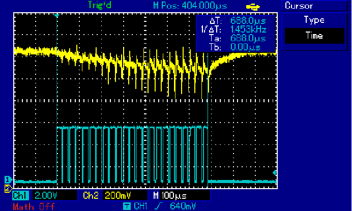 Hallo, ich möchte mit dem Pololu Board 18v25 CS eine Magnetspule mit ca. 950µH per 30kHz PWM bestromen. Für 700µs setze ich die PWM von 0 auf 200 (255 = dauernd ein) und erhalte beim Ein-/ausschalten des Treibers große Spitzen auf dem Strom (gelb, Imax ca 15A). Hat jemand Erfahrung mit dem im Pololu verbauten Stromsensor, streut da was ein...? Eigentlich sollten doch die Ströme nicht springen. Gruß joh