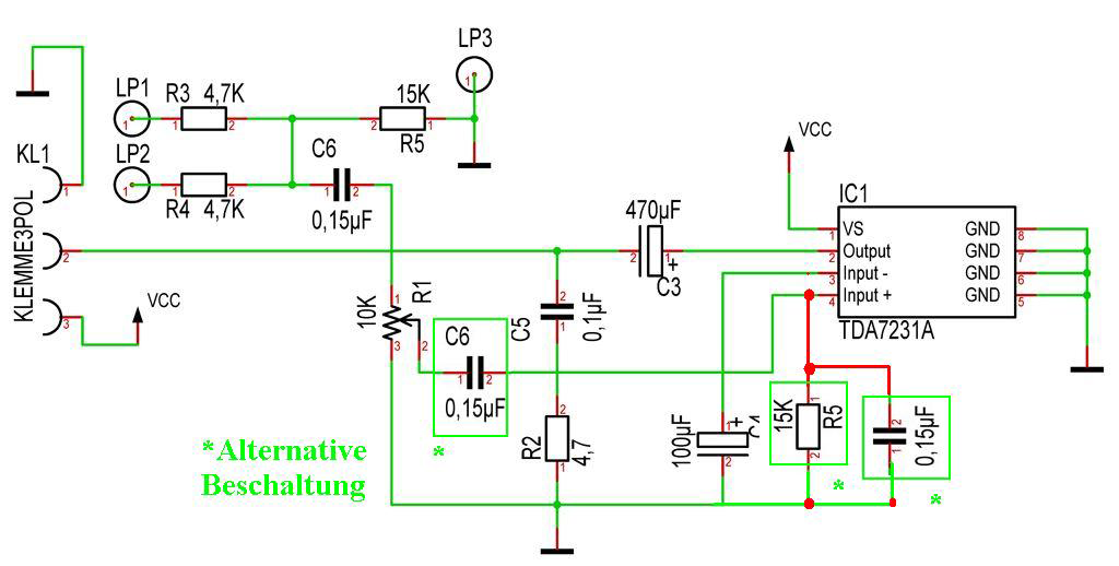 Veit Devil schrieb: > Ich habe den R1 durch ein 10k Poti > ersetzt, Zwecks Pegelanpassung für unterschiedliche NF Eingangsquellen. Geht nicht. Mit dem Schleifer würdest du den Wert von 10K - 0 Ohm verändern. Veit Devil schrieb: > Jetzt denke ich mir, durch die Modifikation mit C7, feht ein Widerstand > danach, sonst arbeitet die Schaltung nicht mehr und es bleibt deswegen > stumm. C7 kann sich nicht entladen. Richtig? Ungefähr richtig. Veit Devil schrieb: > Solche großen Kapazitäten habe ich jetzt nicht da. Auf dem Bild hast du doch 4,7µ Tantal! Veit Devil schrieb: > und noch einen 10k an Pin 4 des TDA gegen > Masse einbauen. Das ist doch der R6! Veit Devil schrieb: > Und Du meinst C6 kann drin bleiben? Ist besser, manche Quellen haben am Ausgang keine C, also würde da Gleichspannung direkt auf dein Poti kommen. Du kannst ihn weglassen, mußt dann aber mit so einem Kondensator die Eingänge zwischen LP1/LP2 und R3/R4 entkoppeln. Wenn du einkaufst, nimm 10µ. Etwas größer schadet nicht. Mit der Plusseite an LP1/LP2. Wenn du genug der 4,7µ Tantal hast, dann schalte parallel.