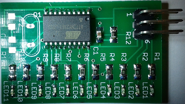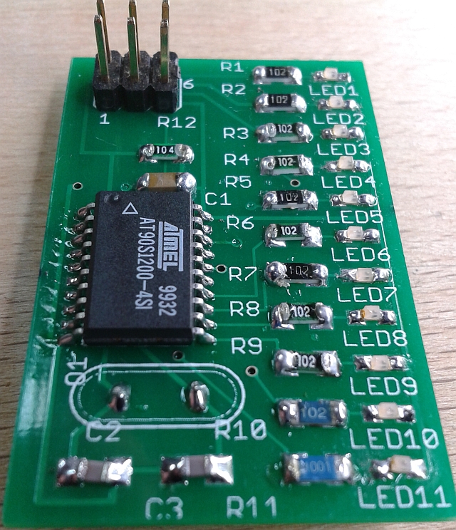 Hallo zusammen, ich verschenke 5 leere Platinen, die bei itead produziert wurden. Details siehe Fotos bzw. beigefügten Schaltplan. Produktionsdaten: doppelseitig, grün, Dicke 1,00 mm, HASL-Finish, ca. 4,3 x ca. 2,8 cm groß Diese eignen sich gut für Lötübungen. Die Bauteile sind als 0805 angelegt. Ich habe bis auf die LEDs und den µC alle übrigen Teile (Widerstände, Kondensatoren) von alten Festplattenelektroniken mit einer Heißluftstation entnommen, was eben da war. Deshalb wurde nicht durchgängig mit 0805 bestückt und als Vorwiderstand 1k (102) bzw. sogar 10k (103) benutzt. ;-) Auf die LED angepasste Widerstände wären hier natürlich deutlich besser. Die ursprüngliche Intention war der erste Versuch, mittels eagle und professionellem Hersteller Platinen zu entwerfen. Bisher wurde immer auf Lochraster gebastelt. Es ist also ein Erstlingswerk, ich bin mir bereits vieler Fehler bewußt. (z.B. für die Handlötung zu kleine Lötpads am IC, ging trotzdem erstaunlich gut; 15 LEDs wären möglich statt 11; keine Beschriftung der Lagen; ungeduldige ;-) Entflechtung; ungünstige Platzierung der Bauteilbeschriftungen usw.) Ungeachtet dessen funktionieren die Platinen zuverlässig und sind fehlerfrei. Gelötet wurde mit einem Weller WECP-20 mit meißelförmiger 2mm-Spitze mit verbleitem 0,5mm-Lötzinn. Als µC geeignet sind ATtiny2313(A), ATTiny4313, AT90S1200(A), AT90S2313(A) und auch AT89C2051/4051 (bei geänderter RESET-Beschaltung) Der ISP-Programmieradapter ist nur für die AVR nutzbar, die 8051-er müssen vorher programmiert werden. Die LEDs stammen aus dem SMD-LED-Sortiment von Pollin bzw. die 0603-Bauform von Reichelt. (z.B. Bestellnummer: LY L29K) Das schnell zusammengeschusterte Testprogramm läuft in AVR-Studio 4.13 mit 3 Warnungen durch. Das kann ein echter ASM-Programmierer (Moby?) bestimmt deutlich verbessern. *Nochmals ausdrücklich: es werden nur unbestückte Platinen abgegeben ohne jede Gewähr auf irgendwas.* Der Erste gewinnt.