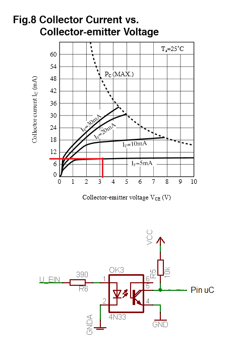 Hallo, möchte über einen optokoppler ein signal einlesen. ich dimensioniere das ganze so, dass I_F=5mA durch die LED fliessen. Nun frage ich mich, was passiert, wenn ich ausversehen meinen Pin als Ausgang/high konfiguriere. dann liegen ja am kollektor des phototransistors 3.3V an (mein uC läuft mit 3.3V). dann müßten doch durch den Phototransistor laut kennlinie um die 9mA fließen?? Ich brauche da also keinen weiteren vorwiderstand, um den phototransistor zu schützen?? sehe ich das richtig? lg