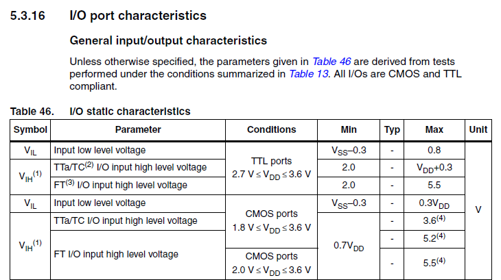 Hallo, im datasheet für den stm32f4 werden ttl und cmos ports unterschieden. welche pins sind denn nun ttl und welche cmos?? wo werden die pins dahingehend gekennzeichnet?? danke