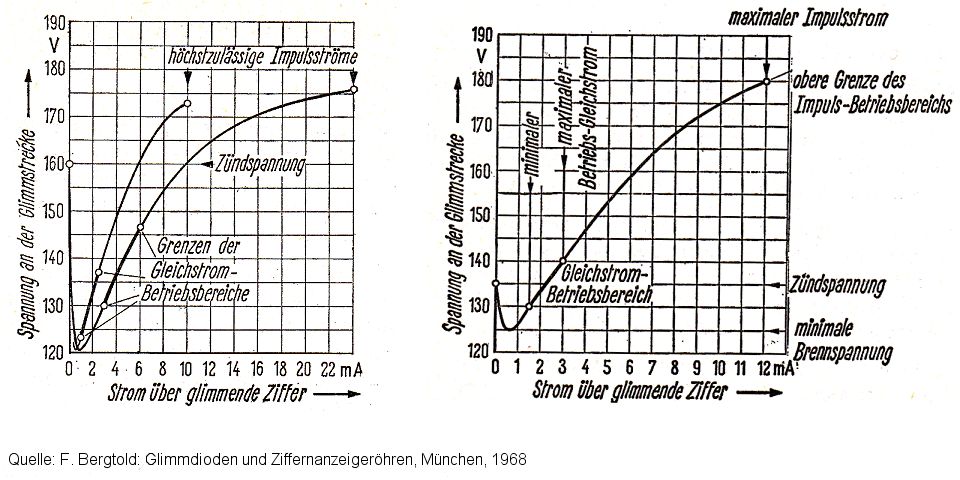 Da unser lieber Jens ja offensichtlich nicht verraten will was er eigentlich beabsichtigt, ist diese ganze Diskusion hier eh für´n Hintern. Nixi nur ein paar Beispiele: Z560 Ziffernhöhe 10mm Brennspannung 140V Brennstrom 1-2mA IN16 Ziffernhöhe 13mm Brennspannung 140V Brennstrom ca.2mA IN14 Ziffernhöhe 18mm Brennspannung 140V Brennstrom 2-3,5mA Z5660 Ziffernhöhe 30mm Brennspannung 140V Brennstrom 3-6mA IN18 Ziffernhöhe 40mm Brennspannung 150V Brennstrom 4-6mA Mit angehängter Schaltung: S1 -> ca.1,6mA S2 -> ca.3,5mA S1 + S2 -> ca.5,1mA Und damit funktionieren auf jeden Fall alle Nixieröhren... Siehe auch meine Nixieseite: http://www.a-reinert.de/NIXIE_Uhren/nixie_uhren.html