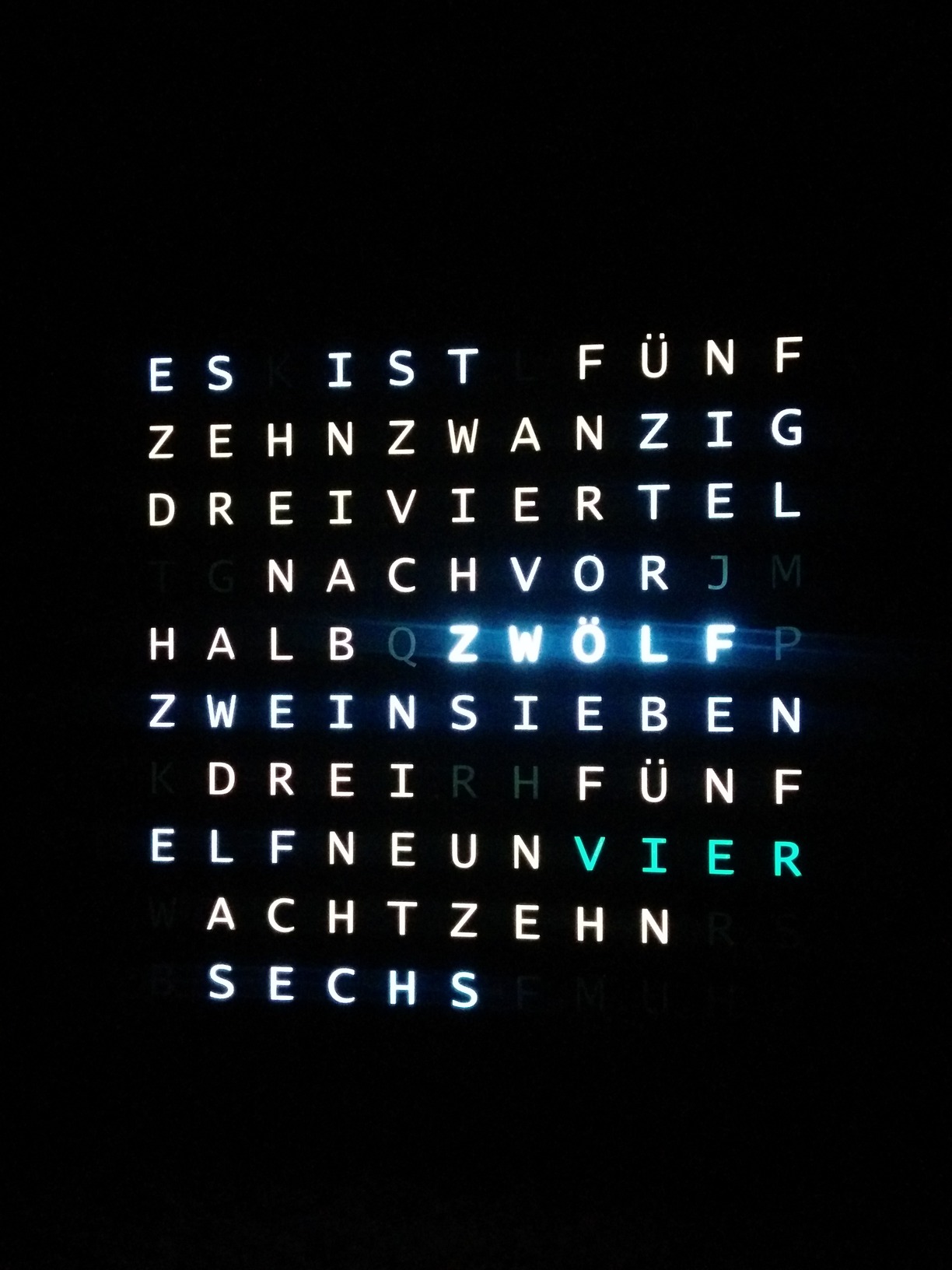 Danke Martin für den Tip. Oje Oje. das sieht aber gar nicht gut aus. Die Farbkanäle sind alle da aber trotzdem unterschiedlich hell. die ZWÖLF strahlt viel heller. Teilweise sind die Wörter auch nur etwas unterschiedlich hell. Ein Bild habe ich angehängt. Mit den leicht unterschiedlichen Helligkeiten könnte ich vielleicht noch leben. bzw müsste ich mal versuchen nachzulöten. Aber das mit der "ZWÖLF" macht mir schon Kopfzerbrechen. Die Hauptplatine sieht eigentlich gut aus und ist einfach zu löten. P.s.: die Minutenpunkte sind momentan noch nicht vorhanden. Sollte aber vermutlich nichts ändern,...