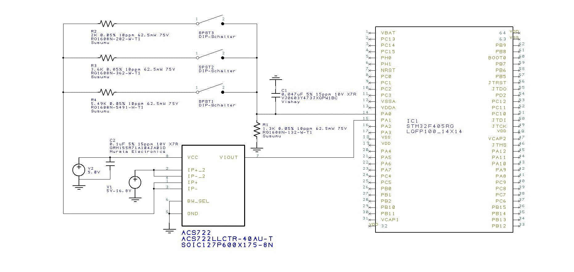 Hallo Habe mich jetzt doch entschieden, aus Kostengründen und wegen der Einfachheit mittels Spannungsteiler zu arbeiten (vorerst). Werde mal damit Erfahrungen sammeln. Muss zwischen 2S und 4S LILO messen können (Spannungsteiler schaltbar mittels DIP-Schalter). Strom mittels ACS722 Sensor. (Werde dann noch einen 5V Regulator einzeichnen. für die Versorung des Sensors, STM32 und andere Geräte) Ich weiss dass die DIP-Schalter ein gewisses Risiko bergen für den ADC.... aber eine einfache Lösung dafür habe ich nicht gefunden (ausser dem Verweneden nur eines Spannungsteilers über den gesammten Bereich von 5-16.8V) Bin aber für jede Hilfe und Hinweise sehr dankbar und freue mich über jede Kritik Gruss Andy