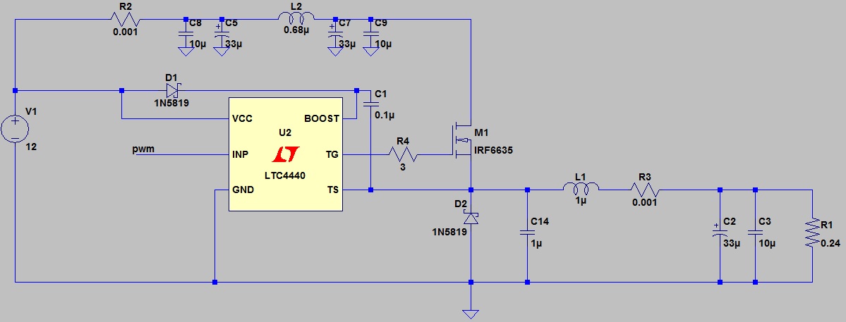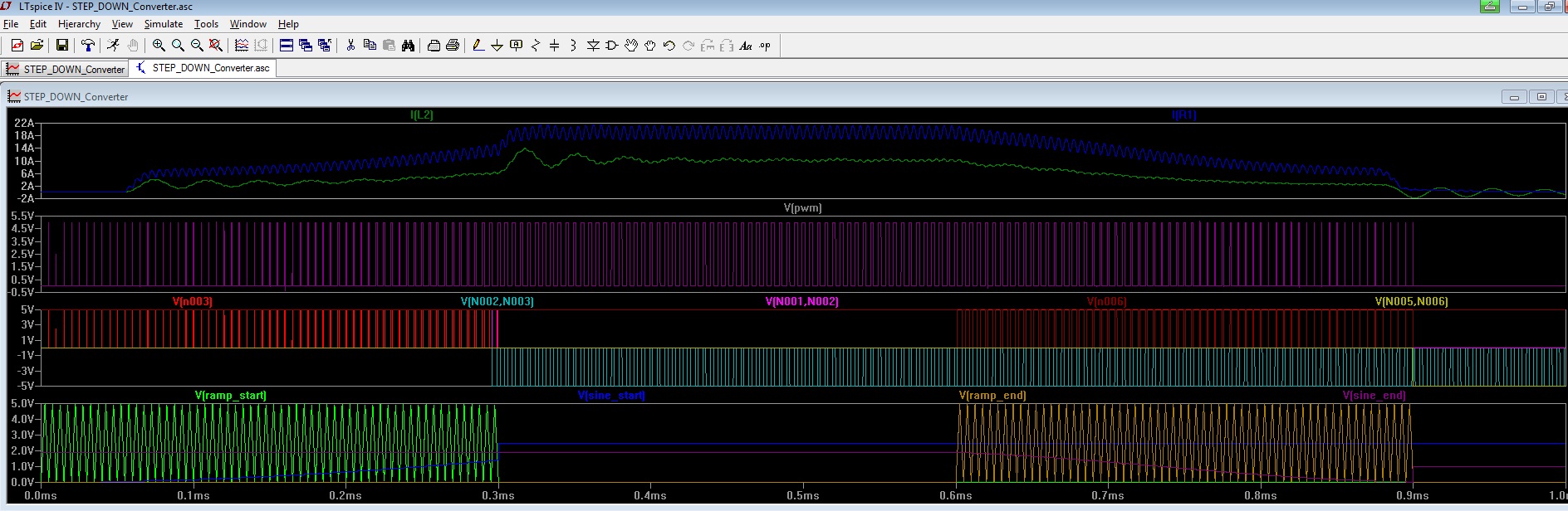 Guten Morgen zusammen. Ich bin gerade dabei meine Step-Down Schaltung mit LTspice zu simulieren. Die Schaltung ist im Anhang zu sehen. Gewollt ist den MOSFET mit einer Softstart PWM anzusteuern und ihn dann mit einer konstanten PWM zu betreiben. Im unteren plot_pane sieht man den Verlauf der Dreiecksspannung [V(ramp_start)} und Sinusspannung [V(sine_start)] mit der ich die Softstart PWM erzeuge. Im 2. PP sieht man V(n003) und V(N002,N003) mit der ich sowohl die Softstart PWM als auch die konstante PWM erzeuge. Der obere PP zeigt den Stromverlauf durch die Induktivität L_2 (PI-Filter) und dem Lastwiderstand R_1. Was mir aufgefallen ist, dass wenn die PWM vom Softstart in den kontinuierlichen Betrieb geht (bei 0.3 ms), erhalte ich im Verlauf I(L_2) Überschwinger. Wieso treten beim Übergang Überschwinger auf und wie können diese beseitigt werden? Hoffe ihr könnt mir da weiter helfen.