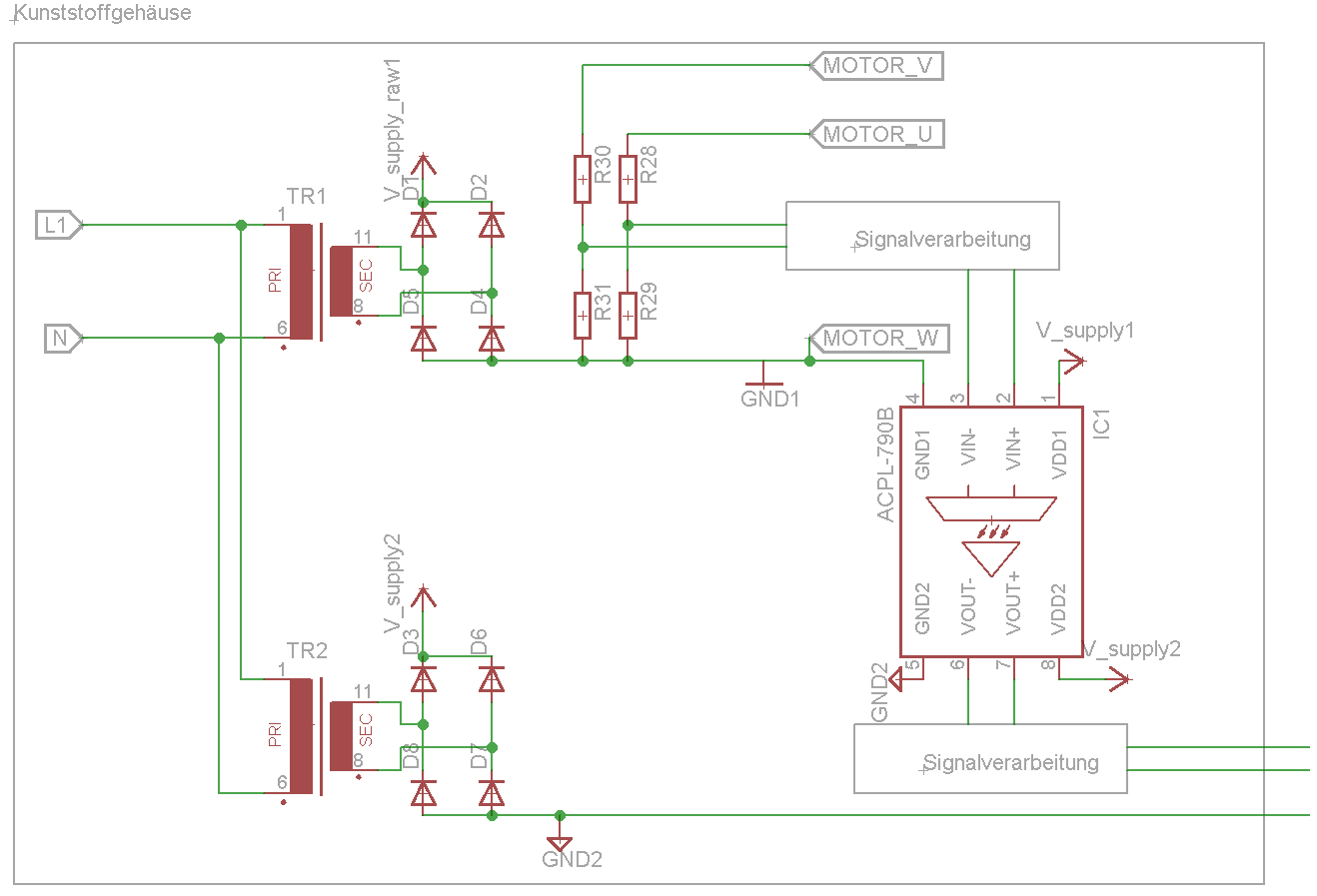 Hallo, wir planen nach einen Frequenzumrichter die Spannungen zwischen den Motorphasen zumessen. Mit galv. trennden Tastköpfen (Testec si9001) funktioniert das ganze schon mal ganz gut, ist aber relativ teuer (ca. 300€ pro Messstelle). Um das günstiger hinzukriegen hab ich mir mal folgendes gedacht: Aus Netzspannung werden mit zwei Printtrafos (Zweikammerwicklung, Zulassung nach VDE, UL, z.b Reichelt EE 20/10 106) zwei galvanisch getrennte Spannungversorgungen aufzubauen. Eine dient dazu die Messtechnik an den Motorphasen zu versorgen und wird dazu groundmäßig mit einer Motorphase verbunden. Die zweite dient dazu die Signalaufbereitung und ev. µC/DSPs zu versorgen. Die Signale sollen dann extern weiterverarbeitet werden (Logger, NI-Module). Von dem her sollte/muss die zweite Stromversorgung berührsicher (Schutzkleinspannung) sein. Die Messsignale werden per Trennverstärker/Optokoppler auf die berührsichere Seite übertragen. Zur Verdeutlichung der Anhang (Das da Sicherungen, Spannungsregler etc. fehlen ist klar ;-)) Soweit zum Hintergrund. Jetzt die Frage. Das Potential der Stromversorgung an der Motorphasen springt durch den FU ja mit 6kHz-20kHz rechtecksförming zwischen +280V und -280V zu Erde. Wird die Isolation von Trafo1 und vorallen die der Optokoppler/Isolationsverstärker dadurch stärker belastet, als wenn eine Gleichspannung oder ein 50Hz Sinus anliegen? viele Grüße Tobi