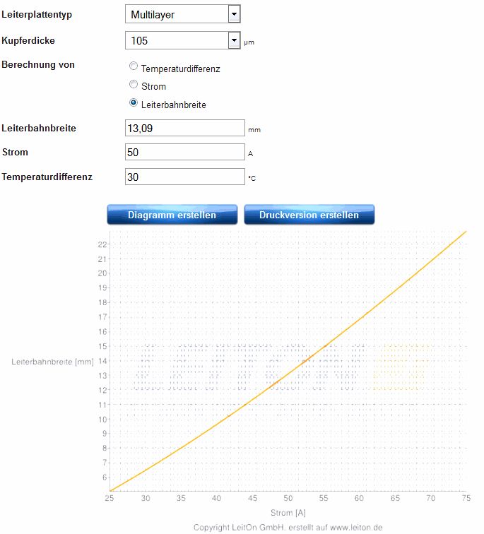 Patrick L. schrieb: > Für eine Kupferschichtdicke von 105µm und einer Erwärmung von 30°C. Ich > finde leider nur Diagramme die bis 35A gehen. Geht doch. Gib einfach die 50A und 30°C ein bei Leiton (dein Link). Oder habe ich das mißverstanden?