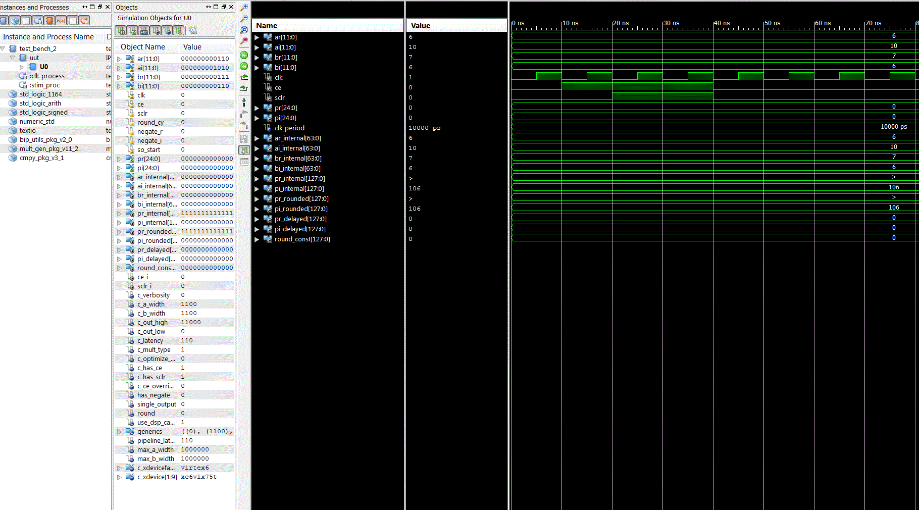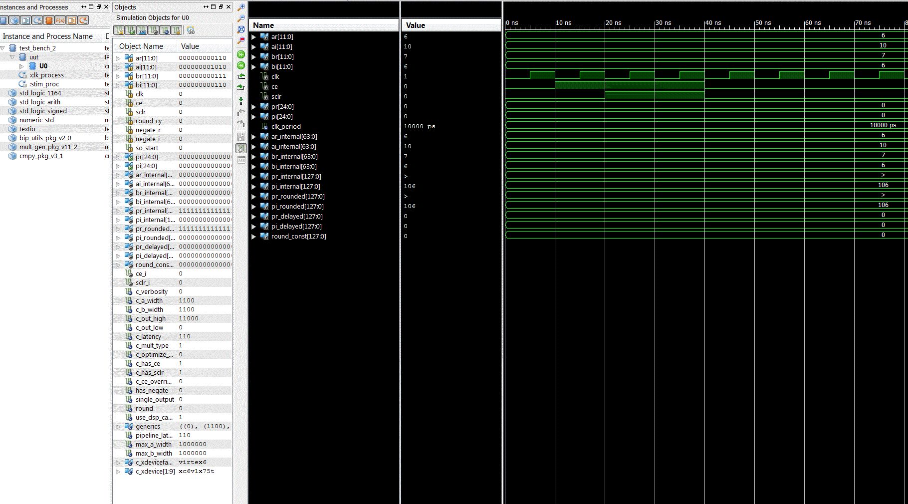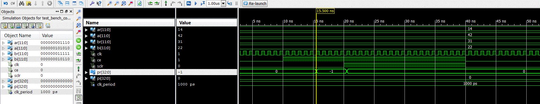 Ich möchte folgenden IP Core unter ISE 14.7 verwenden (Complex Multiplier v3.1). Im Datenblatt steht, dass eine Test Bench nicht unterstützt wird (siehe http://www.xilinx.com/support/documentation/ip_documentation/cmpy_ds291.pdf) Ich habe trotzdem eine Test-Bench angelegt: Die Eingänge (Faktoren) ar, ai, br und bi belege ich mit Werten. Das Signal cs lege ich auf ‚1‘. An den Ausgängen pr und pi sehe ich bei gewissen Eingangskonfigurationen einen Wert (dieser stimmt allerdings nicht mit einem Multiplikationsergebnis überein) . (1) Kann ich den einzelnen IPCore simulieren? (2) Kann ich ein übergeordnetes File simulieren, welches diesen IPCore enthält? (3) Falls "nein", wieso erhalte ich bei gewissen Eingangskonfiguration von ar, ai, br, bi ein Resultat pr, pi in ISIM?? (4) Falls "nein" wie kann ich das ganze „simulierbar“ machen? Vielen Dank